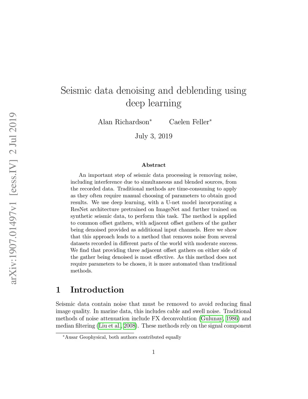 An important step of seismic data processing is removing noise, including interference due to simultaneous and blended sources, from the recorded data. Traditional methods are time-consuming to apply as they often require manual choosing of parameters to obtain good results. We use deep learning, with a U-net model incorporating a ResNet architecture pretrained on ImageNet and further trained on synthetic seismic data, to perform this task. The method is applied to common offset gathers, with adjacent offset gathers of the gather being denoised provided as additional input channels. Here we show that this approach leads to a method that removes noise from several datasets recorded in different parts of the world with moderate success. We find that providing three adjacent offset gathers on either side of the gather being denoised is most effective. As this method does not require parameters to be chosen, it is more automated than traditional methods.
