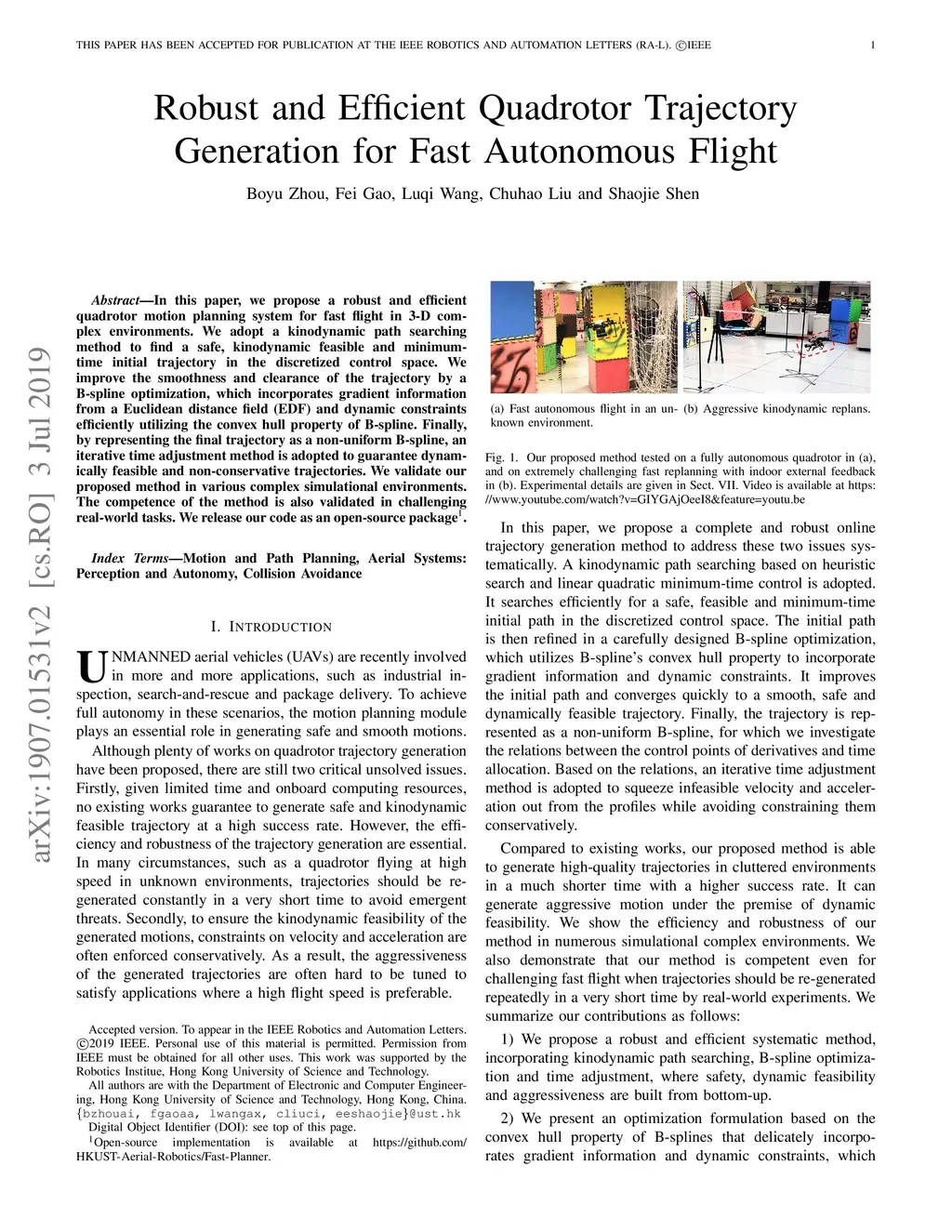 In this paper, we propose a robust and efficient quadrotor motion planning system for fast flight in 3-D complex environments. We adopt a kinodynamic path searching method to find a safe, kinodynamic feasible and minimum-time initial trajectory in the discretized control space. We improve the smoothness and clearance of the trajectory by a B-spline optimization, which incorporates gradient information from a Euclidean distance field (EDF) and dynamic constraints efficiently utilizing the convex hull property of B-spline. Finally, by representing the final trajectory as a non-uniform B-spline, an iterative time adjustment method is adopted to guarantee dynamically feasible and non-conservative trajectories. We validate our proposed method in various complex simulational environments. The competence of the method is also validated in challenging real-world tasks. We release our code as an open-source package.