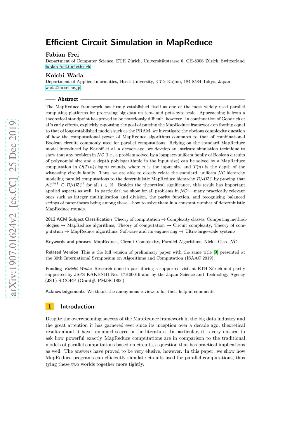 The MapReduce framework has firmly established itself as one of the most widely used parallel computing platforms for processing big data on tera- and peta-byte scale. Approaching it from a theoretical standpoint has proved to be notoriously difficult, however. In continuation of Goodrich et al.'s early efforts, explicitly espousing the goal of putting the MapReduce framework on footing equal to that of long-established models such as the PRAM, we investigate the obvious complexity question of how the computational power of MapReduce algorithms compares to that of combinational Boolean circuits commonly used for parallel computations. Relying on the standard MapReduce model introduced by Karloff et al. a decade ago, we develop an intricate simulation technique to show that any problem in NC (i.e., a problem solved by a logspace-uniform family of Boolean circuits of polynomial size and a depth polylogarithmic in the input size) can be solved by a MapReduce computation in O(T(n)/ log n) rounds, where n is the input size and T(n) is the depth of the witnessing circuit family. Thus, we are able to closely relate the standard, uniform NC hierarchy modeling parallel computations to the deterministic MapReduce hierarchy DMRC by proving that NC^(i+1) is contained in DMRC^i for all natural i, including 0. Besides the theoretical significance, this result that has important applied aspects as well. In particular, we show for all problems in NC^1---many practically relevant ones, such as integer multiplication and division and the parity function, being among these---how to solve them in a constant number of deterministic MapReduce rounds.