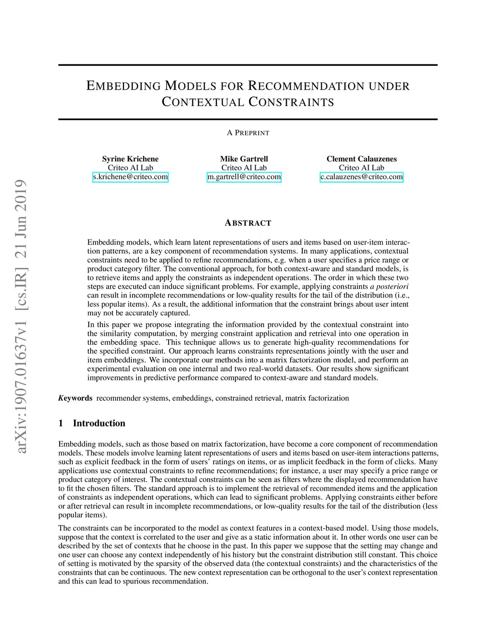 Embedding models, which learn latent representations of users and items based on user-item interaction patterns, are a key component of recommendation systems. In many applications, contextual constraints need to be applied to refine recommendations, e.g. when a user specifies a price range or product category filter. The conventional approach, for both context-aware and standard models, is to retrieve items and apply the constraints as independent operations. The order in which these two steps are executed can induce significant problems. For example, applying constraints a posteriori can result in incomplete recommendations or low-quality results for the tail of the distribution (i.e., less popular items). As a result, the additional information that the constraint brings about user intent may not be accurately captured. In this paper we propose integrating the information provided by the contextual constraint into the similarity computation, by merging constraint application and retrieval into one operation in the embedding space. This technique allows us to generate high-quality recommendations for the specified constraint. Our approach learns constraints representations jointly with the user and item embeddings. We incorporate our methods into a matrix factorization model, and perform an experimental evaluation on one internal and two real-world datasets. Our results show significant improvements in predictive performance compared to context-aware and standard models.