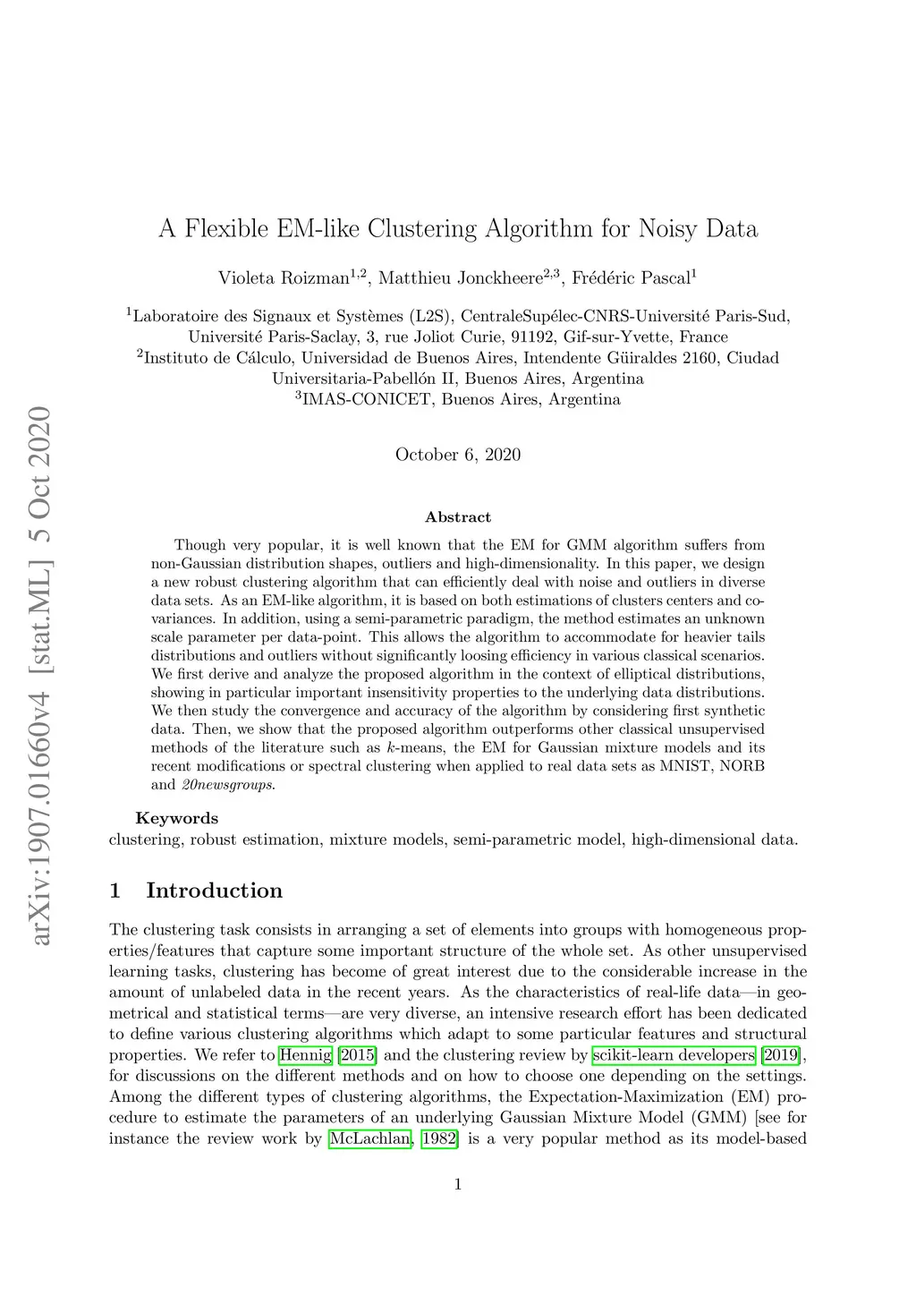 Though very popular, it is well known that the EM for GMM algorithm suffers from non-Gaussian distribution shapes, outliers and high-dimensionality. In this paper, we design a new robust clustering algorithm that can efficiently deal with noise and outliers in diverse data sets. As an EM-like algorithm, it is based on both estimations of clusters centers and covariances. In addition, using a semi-parametric paradigm, the method estimates an unknown scale parameter per data-point. This allows the algorithm to accommodate for heavier tails distributions and outliers without significantly loosing efficiency in various classical scenarios. We first derive and analyze the proposed algorithm in the context of elliptical distributions, showing in particular important insensitivity properties to the underlying data distributions. We then study the convergence and accuracy of the algorithm by considering first synthetic data. Then, we show that the proposed algorithm outperforms other classical unsupervised methods of the literature such as k-means, the EM for Gaussian mixture models and its recent modifications or spectral clustering when applied to real data sets as MNIST, NORB, and 20newsgroups.