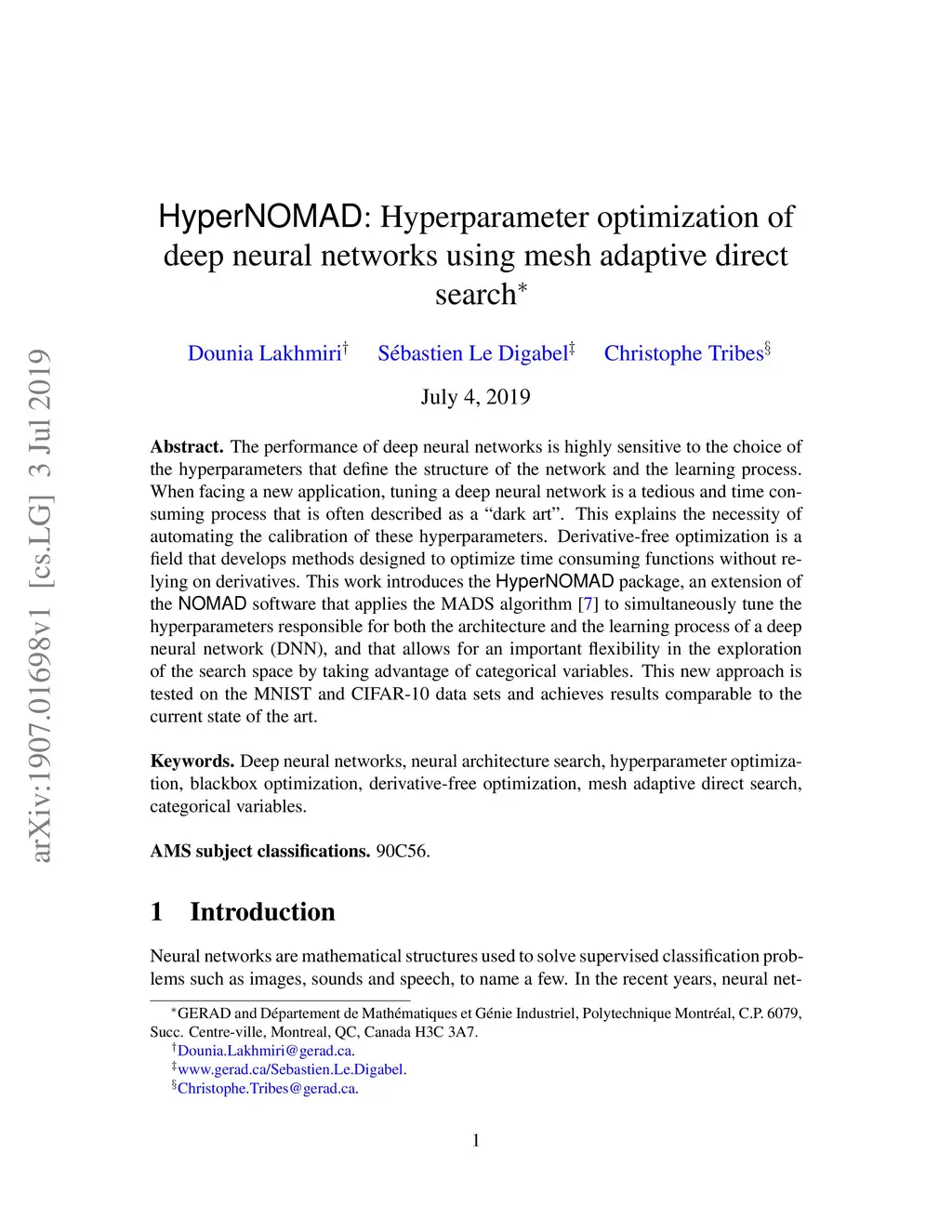 The performance of deep neural networks is highly sensitive to the choice of the hyperparameters that define the structure of the network and the learning process. When facing a new application, tuning a deep neural network is a tedious and time consuming process that is often described as a "dark art". This explains the necessity of automating the calibration of these hyperparameters. Derivative-free optimization is a field that develops methods designed to optimize time consuming functions without relying on derivatives. This work introduces the HyperNOMAD package, an extension of the NOMAD software that applies the MADS algorithm [7] to simultaneously tune the hyperparameters responsible for both the architecture and the learning process of a deep neural network (DNN), and that allows for an important flexibility in the exploration of the search space by taking advantage of categorical variables. This new approach is tested on the MNIST and CIFAR-10 data sets and achieves results comparable to the current state of the art.