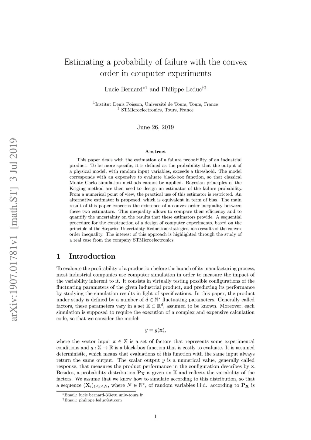 This paper deals with the estimation of a failure probability of an industrial product. To be more specific, it is defined as the probability that the output of a physical model, with random input variables, exceeds a threshold. The model corresponds with an expensive to evaluate black-box function, so that classical Monte Carlo simulation methods cannot be applied. Bayesian principles of the Kriging method are then used to design an estimator of the failure probability. From a numerical point of view, the practical use of this estimator is restricted. An alternative estimator is proposed, which is equivalent in term of bias. The main result of this paper concerns the existence of a convex order inequality between these two estimators. This inequality allows to compare their efficiency and to quantify the uncertainty on the results that these estimators provide. A sequential procedure for the construction of a design of computer experiments, based on the principle of the Stepwise Uncertainty Reduction strategies, also results of the convex order inequality. The interest of this approach is highlighted through the study of a real case from the company STMicroelectronics.