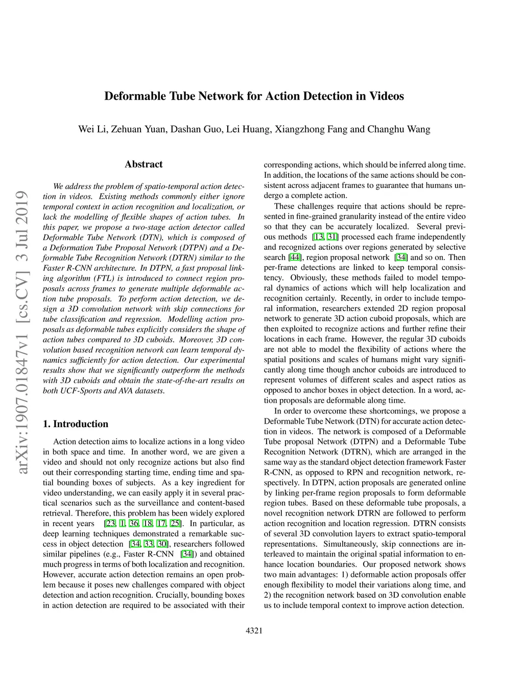 We address the problem of spatio-temporal action detection in videos. Existing methods commonly either ignore temporal context in action recognition and localization, or lack the modelling of flexible shapes of action tubes. In this paper, we propose a two-stage action detector called Deformable Tube Network (DTN), which is composed of a Deformation Tube Proposal Network (DTPN) and a Deformable Tube Recognition Network (DTRN) similar to the Faster R-CNN architecture. In DTPN, a fast proposal linking algorithm (FTL) is introduced to connect region proposals across frames to generate multiple deformable action tube proposals. To perform action detection, we design a 3D convolution network with skip connections for tube classification and regression. Modelling action proposals as deformable tubes explicitly considers the shape of action tubes compared to 3D cuboids. Moreover, 3D convolution based recognition network can learn temporal dynamics sufficiently for action detection. Our experimental results show that we significantly outperform the methods with 3D cuboids and obtain the state-of-the-art results on both UCF-Sports and AVA datasets.