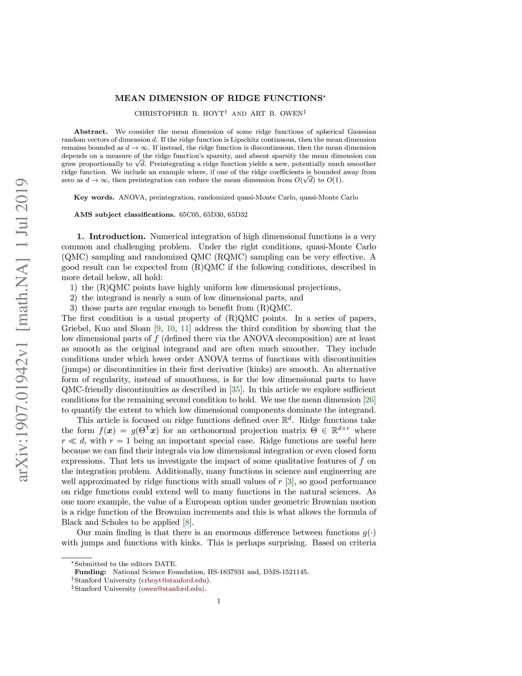 We consider the mean dimension of some ridge functions of spherical Gaussian random vectors of dimension . If the ridge function is Lipschitz continuous, then the mean dimension remains bounded as . If instead, the ridge function is discontinuous, then the mean dimension depends on a measure of the ridge function's sparsity, and absent sparsity the mean dimension can grow proportionally to . Preintegrating a ridge function yields a new, potentially much smoother ridge function. We include an example where, if one of the ridge coefficients is bounded away from zero as , then preintegration can reduce the mean dimension from to .