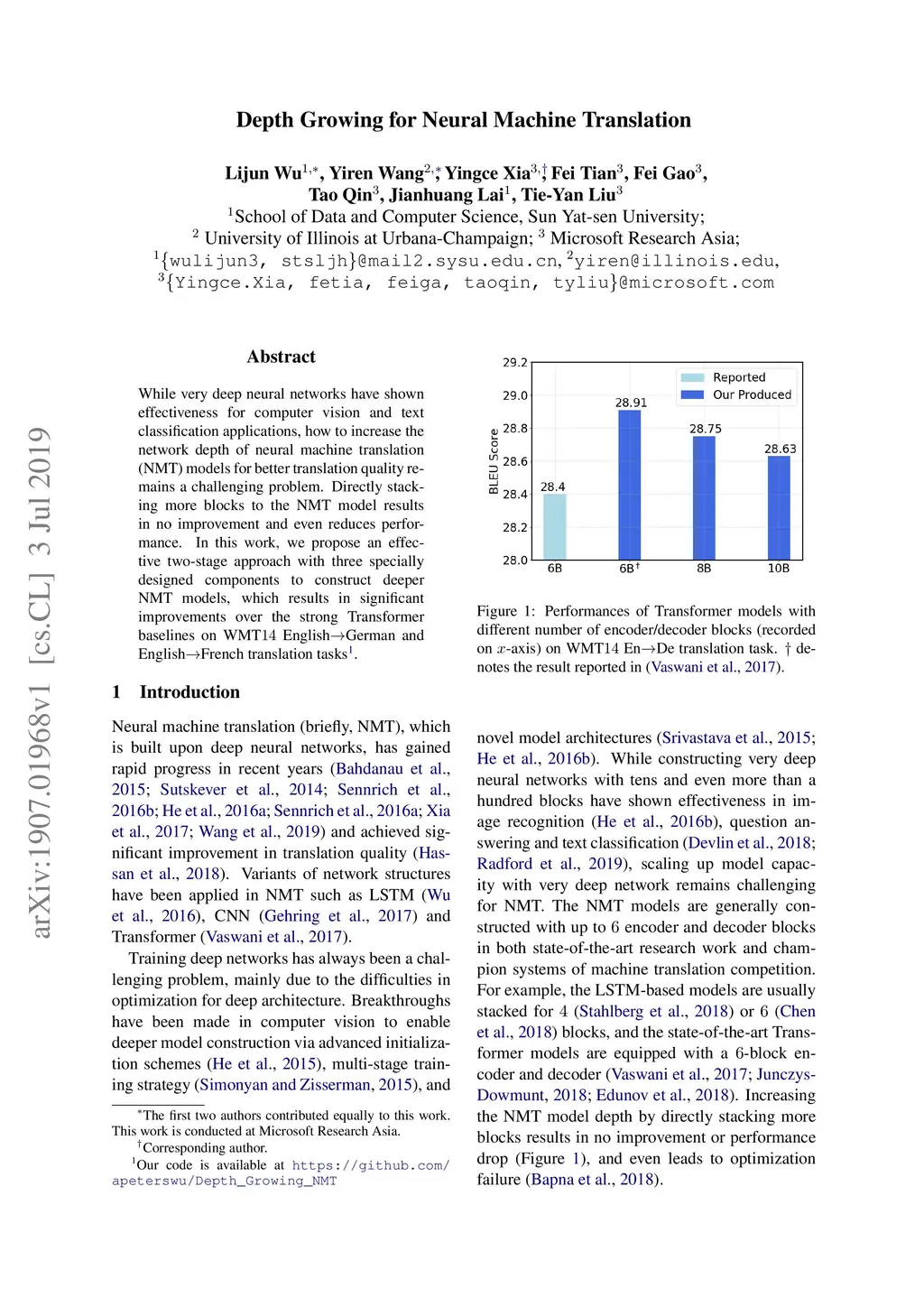 While very deep neural networks have shown effectiveness for computer vision and text classification applications, how to increase the network depth of neural machine translation (NMT) models for better translation quality remains a challenging problem. Directly stacking more blocks to the NMT model results in no improvement and even reduces performance. In this work, we propose an effective two-stage approach with three specially designed components to construct deeper NMT models, which result in significant improvements over the strong Transformer baselines on WMT EnglishGerman and EnglishFrench translation tasks\footnote{Our code is available at \url{https://github.com/apeterswu/Depth_Growing_NMT}}.