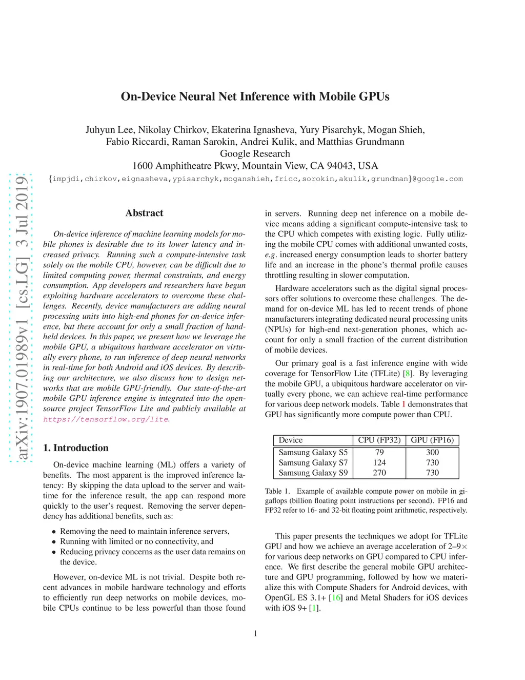 On-device inference of machine learning models for mobile phones is desirable due to its lower latency and increased privacy. Running such a compute-intensive task solely on the mobile CPU, however, can be difficult due to limited computing power, thermal constraints, and energy consumption. App developers and researchers have begun exploiting hardware accelerators to overcome these challenges. Recently, device manufacturers are adding neural processing units into high-end phones for on-device inference, but these account for only a small fraction of hand-held devices. In this paper, we present how we leverage the mobile GPU, a ubiquitous hardware accelerator on virtually every phone, to run inference of deep neural networks in real-time for both Android and iOS devices. By describing our architecture, we also discuss how to design networks that are mobile GPU-friendly. Our state-of-the-art mobile GPU inference engine is integrated into the open-source project TensorFlow Lite and publicly available at https://tensorflow.org/lite.