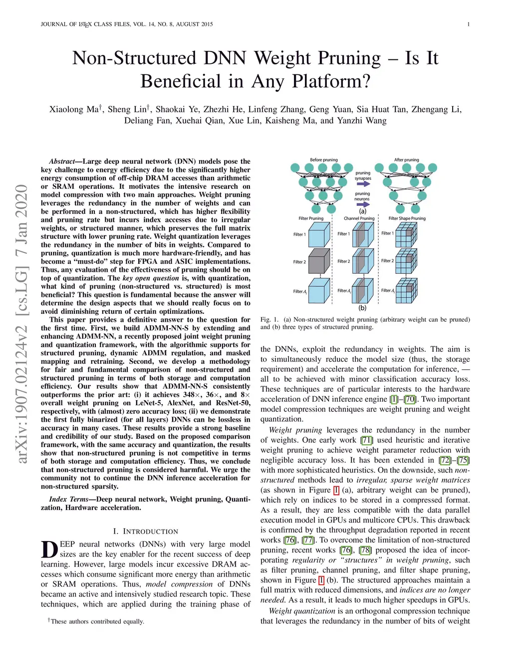 Large deep neural network (DNN) models pose the key challenge to energy efficiency due to the significantly higher energy consumption of off-chip DRAM accesses than arithmetic or SRAM operations. It motivates the intensive research on model compression with two main approaches. Weight pruning leverages the redundancy in the number of weights and can be performed in a non-structured, which has higher flexibility and pruning rate but incurs index accesses due to irregular weights, or structured manner, which preserves the full matrix structure with lower pruning rate. Weight quantization leverages the redundancy in the number of bits in weights. Compared to pruning, quantization is much more hardware-friendly, and has become a "must-do" step for FPGA and ASIC implementations. This paper provides a definitive answer to the question for the first time. First, we build ADMM-NN-S by extending and enhancing ADMM-NN, a recently proposed joint weight pruning and quantization framework. Second, we develop a methodology for fair and fundamental comparison of non-structured and structured pruning in terms of both storage and computation efficiency. Our results show that ADMM-NN-S consistently outperforms the prior art: (i) it achieves 348x, 36x, and 8x overall weight pruning on LeNet-5, AlexNet, and ResNet-50, respectively, with (almost) zero accuracy loss; (ii) we demonstrate the first fully binarized (for all layers) DNNs can be lossless in accuracy in many cases. These results provide a strong baseline and credibility of our study. Based on the proposed comparison framework, with the same accuracy and quantization, the results show that non-structrued pruning is not competitive in terms of both storage and computation efficiency. Thus, we conclude that non-structured pruning is considered harmful. We urge the community not to continue the DNN inference acceleration for non-structured sparsity.