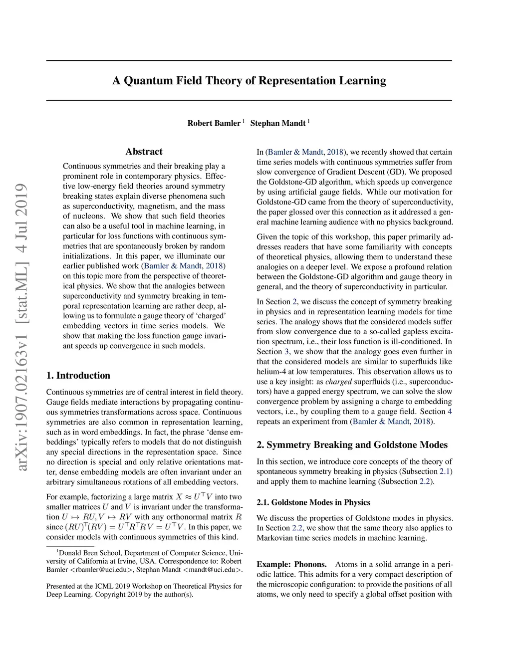 Continuous symmetries and their breaking play a prominent role in contemporary physics. Effective low-energy field theories around symmetry breaking states explain diverse phenomena such as superconductivity, magnetism, and the mass of nucleons. We show that such field theories can also be a useful tool in machine learning, in particular for loss functions with continuous symmetries that are spontaneously broken by random initializations. In this paper, we illuminate our earlier published work (Bamler & Mandt, 2018) on this topic more from the perspective of theoretical physics. We show that the analogies between superconductivity and symmetry breaking in temporal representation learning are rather deep, allowing us to formulate a gauge theory of `charged' embedding vectors in time series models. We show that making the loss function gauge invariant speeds up convergence in such models.