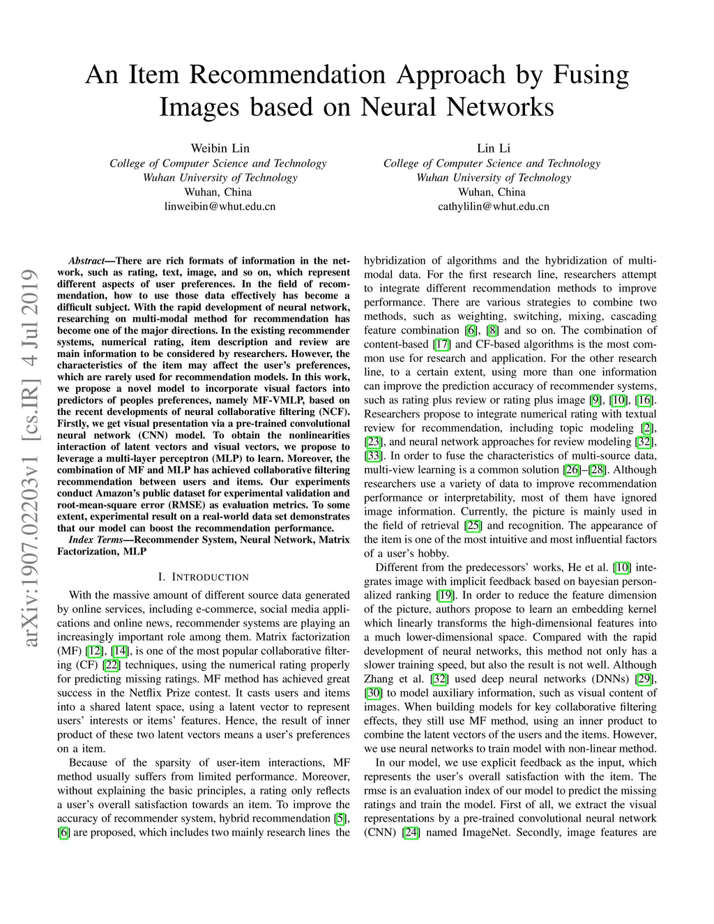 There are rich formats of information in the network, such as rating, text, image, and so on, which represent different aspects of user preferences. In the field of recommendation, how to use those data effectively has become a difficult subject. With the rapid development of neural network, researching on multi-modal method for recommendation has become one of the major directions. In the existing recommender systems, numerical rating, item description and review are main information to be considered by researchers. However, the characteristics of the item may affect the user's preferences, which are rarely used for recommendation models. In this work, we propose a novel model to incorporate visual factors into predictors of people's preferences, namely MF-VMLP, based on the recent developments of neural collaborative filtering (NCF). Firstly, we get visual presentation via a pre-trained convolutional neural network (CNN) model. To obtain the nonlinearities interaction of latent vectors and visual vectors, we propose to leverage a multi-layer perceptron (MLP) to learn. Moreover, the combination of MF and MLP has achieved collaborative filtering recommendation between users and items. Our experiments conduct Amazon's public dataset for experimental validation and root-mean-square error (RMSE) as evaluation metrics. To some extent, experimental result on a real-world data set demonstrates that our model can boost the recommendation performance.