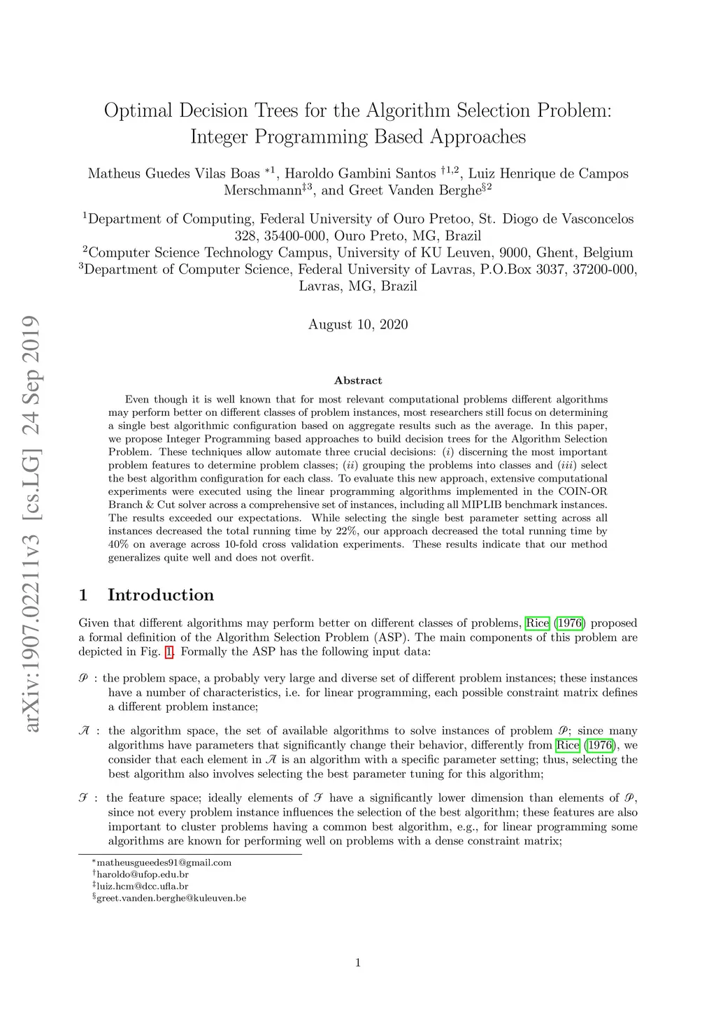 Even though it is well known that for most relevant computational problems different algorithms may perform better on different classes of problem instances, most researchers still focus on determining a single best algorithmic configuration based on aggregate results such as the average. In this paper, we propose Integer Programming based approaches to build decision trees for the Algorithm Selection Problem. These techniques allow automate three crucial decisions: (i) discerning the most important problem features to determine problem classes; (ii) grouping the problems into classes and (iii) select the best algorithm configuration for each class. To evaluate this new approach, extensive computational experiments were executed using the linear programming algorithms implemented in the COIN-OR Branch & Cut solver across a comprehensive set of instances, including all MIPLIB benchmark instances. The results exceeded our expectations. While selecting the single best parameter setting across all instances decreased the total running time by 22%, our approach decreased the total running time by 40% on average across 10-fold cross validation experiments. These results indicate that our method generalizes quite well and does not overfit.