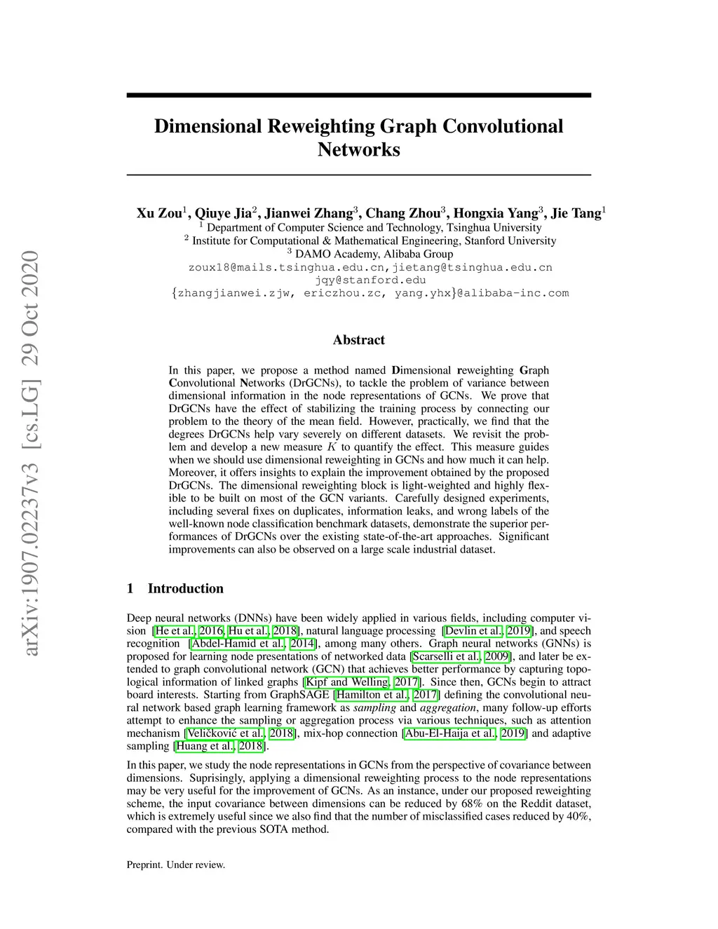 Graph Convolution Networks (GCNs) are becoming more and more popular for learning node representations on graphs. Though there exist various developments on sampling and aggregation to accelerate the training process and improve the performances, limited works focus on dealing with the dimensional information imbalance of node representations. To bridge the gap, we propose a method named Dimensional reweighting Graph Convolution Network (DrGCN). We theoretically prove that our DrGCN can guarantee to improve the stability of GCNs via mean field theory. Our dimensional reweighting method is very flexible and can be easily combined with most sampling and aggregation techniques for GCNs. Experimental results demonstrate its superior performances on several challenging transductive and inductive node classification benchmark datasets. Our DrGCN also outperforms existing models on an industrial-sized Alibaba recommendation dataset.