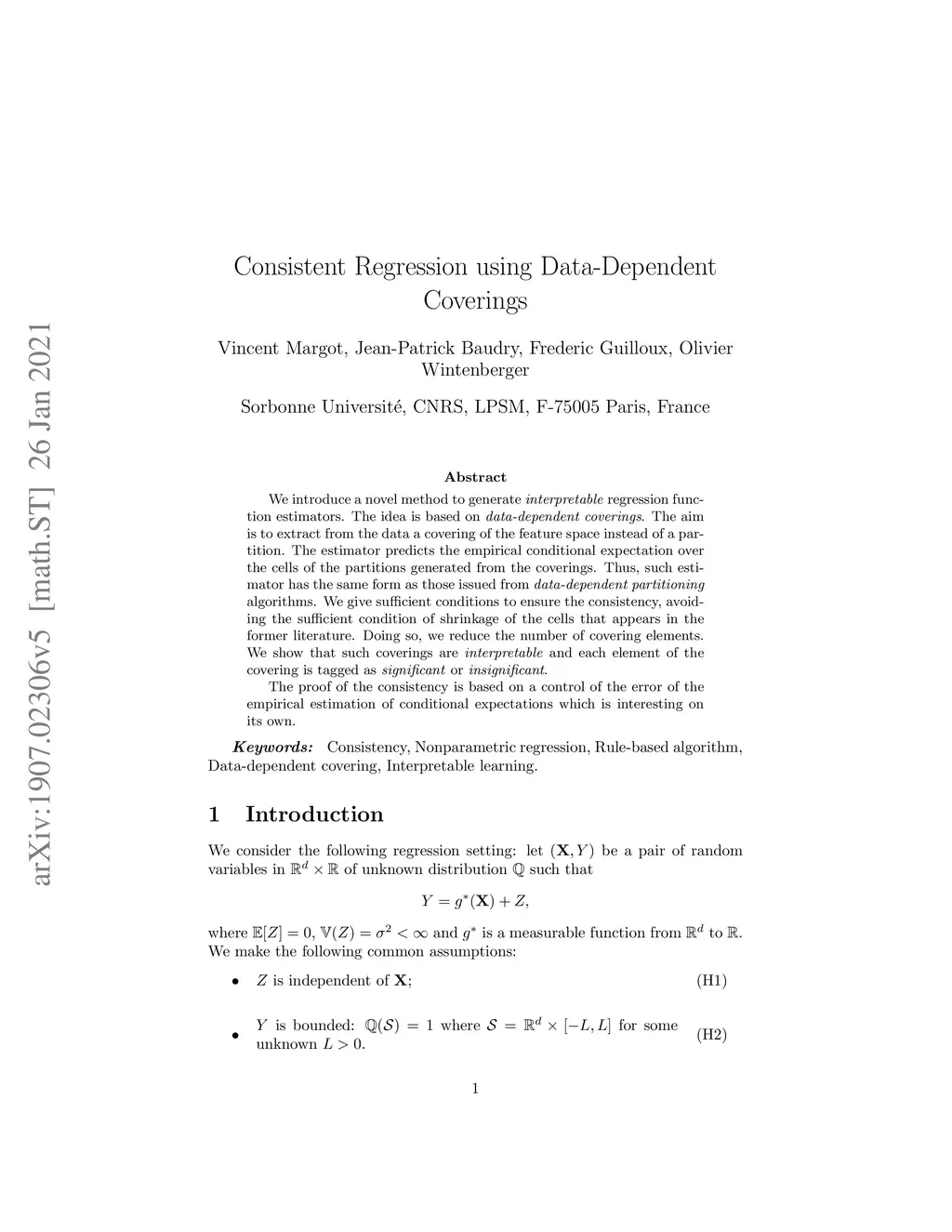 In this paper, we introduce a novel method to generate interpretable regression function estimators. The idea is based on called data-dependent coverings. The aim is to extract from the data a covering of the feature space instead of a partition. The estimator predicts the empirical conditional expectation over the cells of the partitions generated from the coverings. Thus, such estimator has the same form as those issued from data-dependent partitioning algorithms. We give sufficient conditions to ensure the consistency, avoiding the sufficient condition of shrinkage of the cells that appears in the former literature. Doing so, we reduce the number of covering elements. We show that such coverings are interpretable and each element of the covering is tagged as significant or insignificant. The proof of the consistency is based on a control of the error of the empirical estimation of conditional expectations which is interesting on its own.