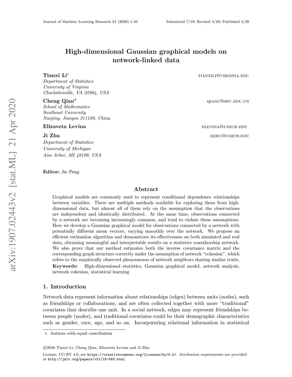 Graphical models are commonly used to represent conditional dependence relationships between variables. There are multiple methods available for exploring them from high-dimensional data, but almost all of them rely on the assumption that the observations are independent and identically distributed. At the same time, observations connected by a network are becoming increasingly common, and tend to violate these assumptions. Here we develop a Gaussian graphical model for observations connected by a network with potentially different mean vectors, varying smoothly over the network. We propose an efficient estimation algorithm and demonstrate its effectiveness on both simulated and real data, obtaining meaningful and interpretable results on a statistics coauthorship network. We also prove that our method estimates both the inverse covariance matrix and the corresponding graph structure correctly under the assumption of network “cohesion”, which refers to the empirically observed phenomenon of network neighbors sharing similar traits.