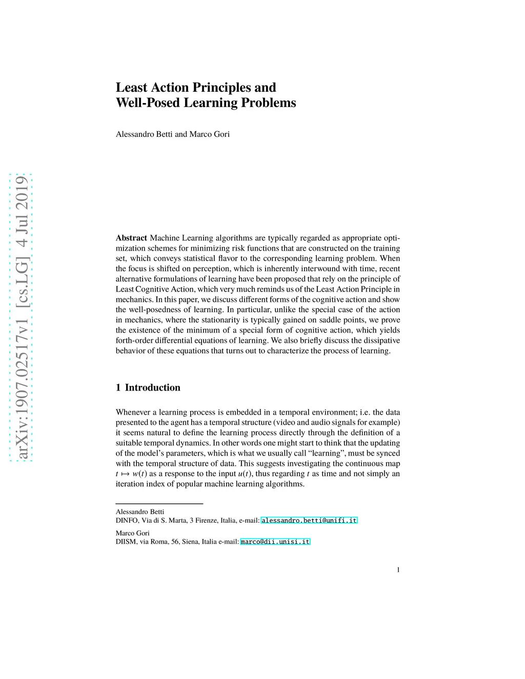 Machine Learning algorithms are typically regarded as appropriate optimization schemes for minimizing risk functions that are constructed on the training set, which conveys statistical flavor to the corresponding learning problem. When the focus is shifted on perception, which is inherently interwound with time, recent alternative formulations of learning have been proposed that rely on the principle of Least Cognitive Action, which very much reminds us of the Least Action Principle in mechanics. In this paper, we discuss different forms of the cognitive action and show the well-posedness of learning. In particular, unlike the special case of the action in mechanics, where the stationarity is typically gained on saddle points, we prove the existence of the minimum of a special form of cognitive action, which yields forth-order differential equations of learning. We also briefly discuss the dissipative behavior of these equations that turns out to characterize the process of learning.
