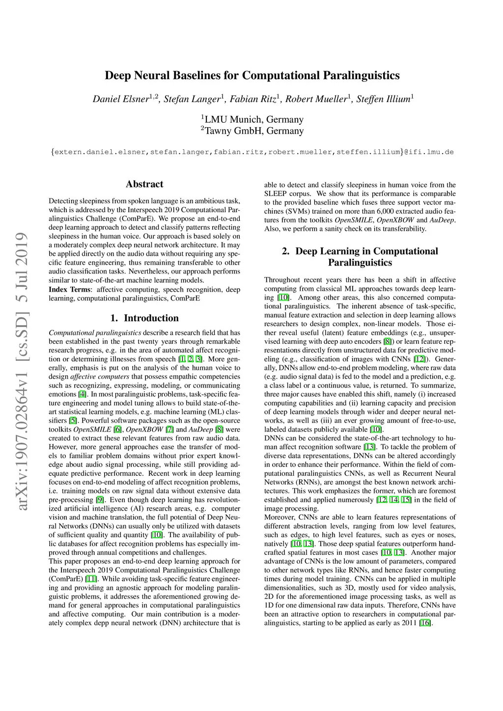 Detecting sleepiness from spoken language is an ambitious task, which is addressed by the Interspeech 2019 Computational Paralinguistics Challenge (ComParE). We propose an end-to-end deep learning approach to detect and classify patterns reflecting sleepiness in the human voice. Our approach is based solely on a moderately complex deep neural network architecture. It may be applied directly on the audio data without requiring any specific feature engineering, thus remaining transferable to other audio classification tasks. Nevertheless, our approach performs similar to state-of-the-art machine learning models.