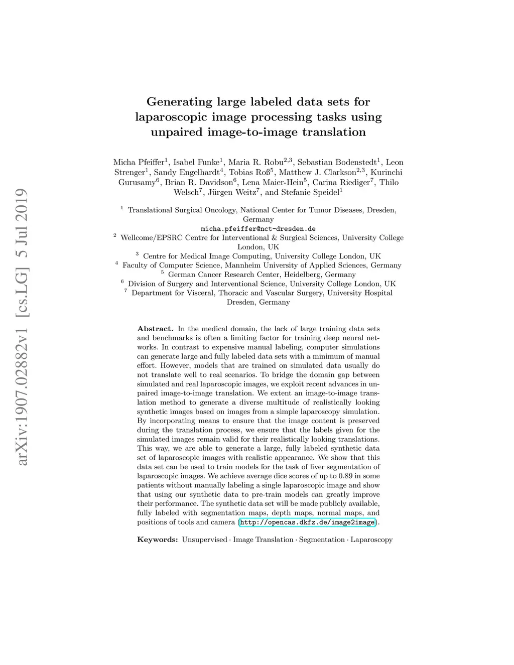 In the medical domain, the lack of large training data sets and benchmarks is often a limiting factor for training deep neural networks. In contrast to expensive manual labeling, computer simulations can generate large and fully labeled data sets with a minimum of manual effort. However, models that are trained on simulated data usually do not translate well to real scenarios. To bridge the domain gap between simulated and real laparoscopic images, we exploit recent advances in unpaired image-to-image translation. We extent an image-to-image translation method to generate a diverse multitude of realistically looking synthetic images based on images from a simple laparoscopy simulation. By incorporating means to ensure that the image content is preserved during the translation process, we ensure that the labels given for the simulated images remain valid for their realistically looking translations. This way, we are able to generate a large, fully labeled synthetic data set of laparoscopic images with realistic appearance. We show that this data set can be used to train models for the task of liver segmentation of laparoscopic images. We achieve average dice scores of up to 0.89 in some patients without manually labeling a single laparoscopic image and show that using our synthetic data to pre-train models can greatly improve their performance. The synthetic data set will be made publicly available, fully labeled with segmentation maps, depth maps, normal maps, and positions of tools and camera (http://opencas.dkfz.de/image2image).
