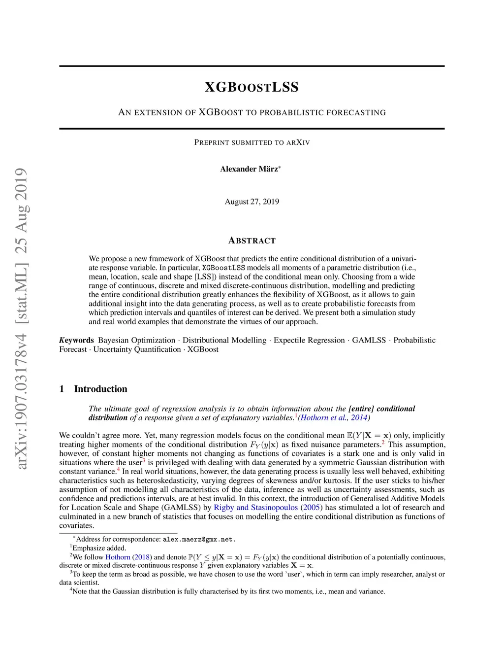 We propose a new framework of XGBoost that predicts the entire conditional distribution of a univariate response variable. In particular, XGBoostLSS models all moments of a parametric distribution (i.e., mean, location, scale and shape [LSS]) instead of the conditional mean only. Choosing from a wide range of continuous, discrete and mixed discrete-continuous distribution, modelling and predicting the entire conditional distribution greatly enhances the flexibility of XGBoost, as it allows to gain additional insight into the data generating process, as well as to create probabilistic forecasts from which prediction intervals and quantiles of interest can be derived. We present both a simulation study and real world examples that demonstrate the virtues of our approach.