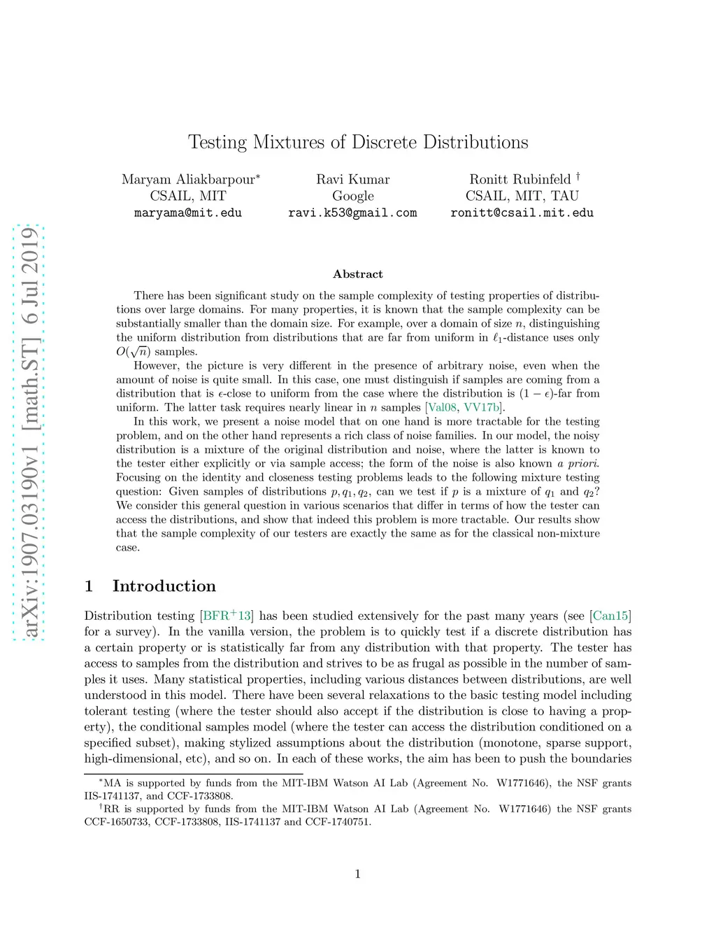 There has been significant study on the sample complexity of testing properties of distributions over large domains. For many properties, it is known that the sample complexity can be substantially smaller than the domain size. For example, over a domain of size , distinguishing the uniform distribution from distributions that are far from uniform in -distance uses only samples. However, the picture is very different in the presence of arbitrary noise, even when the amount of noise is quite small. In this case, one must distinguish if samples are coming from a distribution that is -close to uniform from the case where the distribution is -far from uniform. The latter task requires nearly linear in samples [Valiant 2008, Valian and Valiant 2011]. In this work, we present a noise model that on one hand is more tractable for the testing problem, and on the other hand represents a rich class of noise families. In our model, the noisy distribution is a mixture of the original distribution and noise, where the latter is known to the tester either explicitly or via sample access; the form of the noise is also known a priori. Focusing on the identity and closeness testing problems leads to the following mixture testing question: Given samples of distributions , can we test if is a mixture of and ? We consider this general question in various scenarios that differ in terms of how the tester can access the distributions, and show that indeed this problem is more tractable. Our results show that the sample complexity of our testers are exactly the same as for the classical non-mixture case.