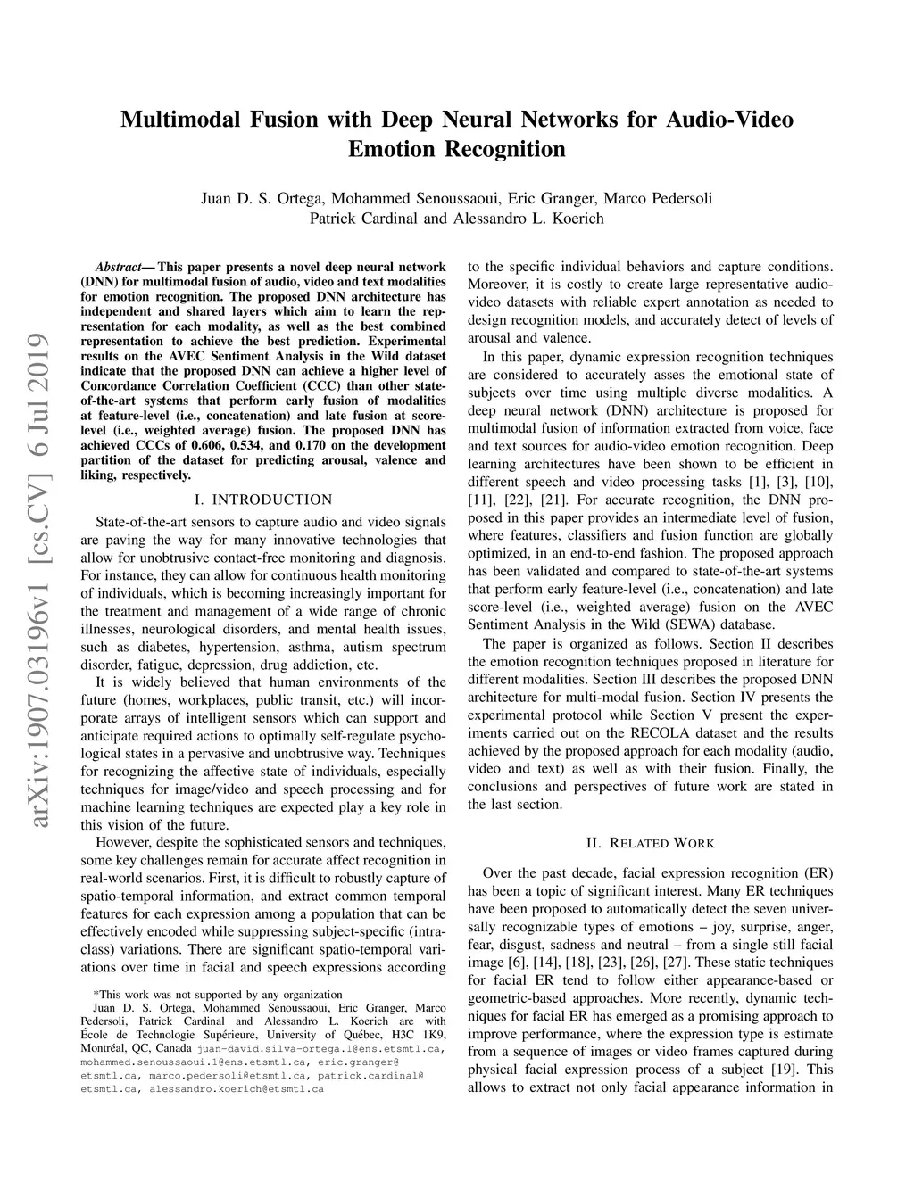 This paper presents a novel deep neural network (DNN) for multimodal fusion of audio, video and text modalities for emotion recognition. The proposed DNN architecture has independent and shared layers which aim to learn the representation for each modality, as well as the best combined representation to achieve the best prediction. Experimental results on the AVEC Sentiment Analysis in the Wild dataset indicate that the proposed DNN can achieve a higher level of Concordance Correlation Coefficient (CCC) than other state-of-the-art systems that perform early fusion of modalities at feature-level (i.e., concatenation) and late fusion at score-level (i.e., weighted average) fusion. The proposed DNN has achieved CCCs of 0.606, 0.534, and 0.170 on the development partition of the dataset for predicting arousal, valence and liking, respectively.