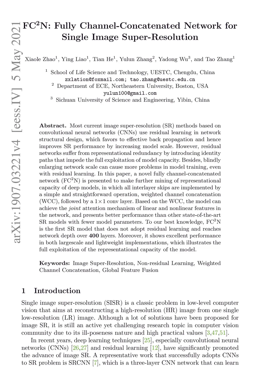 Most current image super-resolution (SR) methods based on convolutional neural networks (CNNs) use residual learning in network structural design, which favors to effective back propagation and hence improves SR performance by increasing model scale. However, residual networks suffer from representational redundancy by introducing identity paths that impede the full exploitation of model capacity. Besides, blindly enlarging network scale can cause more problems in model training, even with residual learning. In this paper, a novel fully channel-concatenated network (FCN) is presented to make further mining of representational capacity of deep models, in which all interlayer skips are implemented by a simple and straightforward operation, i.e., weighted channel concatenation (WCC), followed by a 11 conv layer. Based on the WCC, the model can achieve the joint attention mechanism of linear and nonlinear features in the network, and presents better performance than other state-of-the-art SR models with fewer model parameters. To our best knowledge, FCN is the first CNN model that does not use residual learning and reaches network depth over 400 layers. Moreover, it shows excellent performance in both largescale and lightweight implementations, which illustrates the full exploitation of the representational capacity of the model.