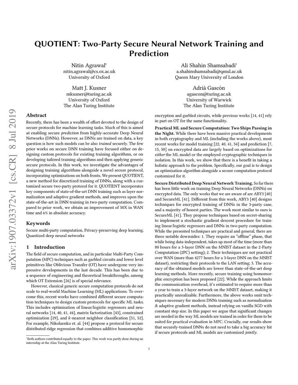 QUOTIENT: Two-Party Secure Neural Network Training and Prediction