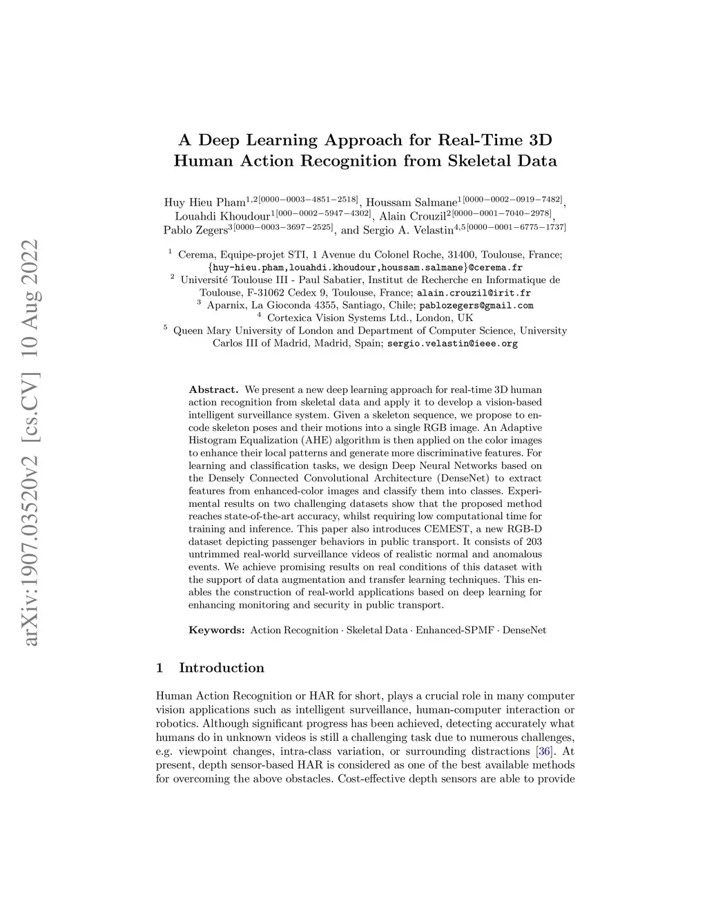 We present a new deep learning approach for real-time 3D human action recognition from skeletal data and apply it to develop a vision-based intelligent surveillance system. Given a skeleton sequence, we propose to encode skeleton poses and their motions into a single RGB image. An Adaptive Histogram Equalization (AHE) algorithm is then applied on the color images to enhance their local patterns and generate more discriminative features. For learning and classification tasks, we design Deep Neural Networks based on the Densely Connected Convolutional Architecture (DenseNet) to extract features from enhanced-color images and classify them into classes. Experimental results on two challenging datasets show that the proposed method reaches state-of-the-art accuracy, whilst requiring low computational time for training and inference. This paper also introduces CEMEST, a new RGB-D dataset depicting passenger behaviors in public transport. It consists of 203 untrimmed real-world surveillance videos of realistic normal and anomalous events. We achieve promising results on real conditions of this dataset with the support of data augmentation and transfer learning techniques. This enables the construction of real-world applications based on deep learning for enhancing monitoring and security in public transport.