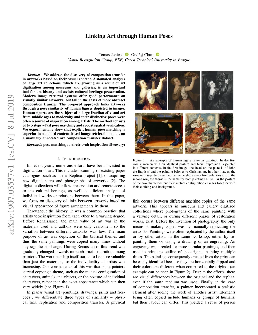 We address the discovery of composition transfer in artworks based on their visual content. Automated analysis of large art collections, which are growing as a result of art digitization among museums and galleries, is an important tool for art history and assists cultural heritage preservation. Modern image retrieval systems offer good performance on visually similar artworks, but fail in the cases of more abstract composition transfer. The proposed approach links artworks through a pose similarity of human figures depicted in images. Human figures are the subject of a large fraction of visual art from middle ages to modernity and their distinctive poses were often a source of inspiration among artists. The method consists of two steps -- fast pose matching and robust spatial verification. We experimentally show that explicit human pose matching is superior to standard content-based image retrieval methods on a manually annotated art composition transfer dataset.