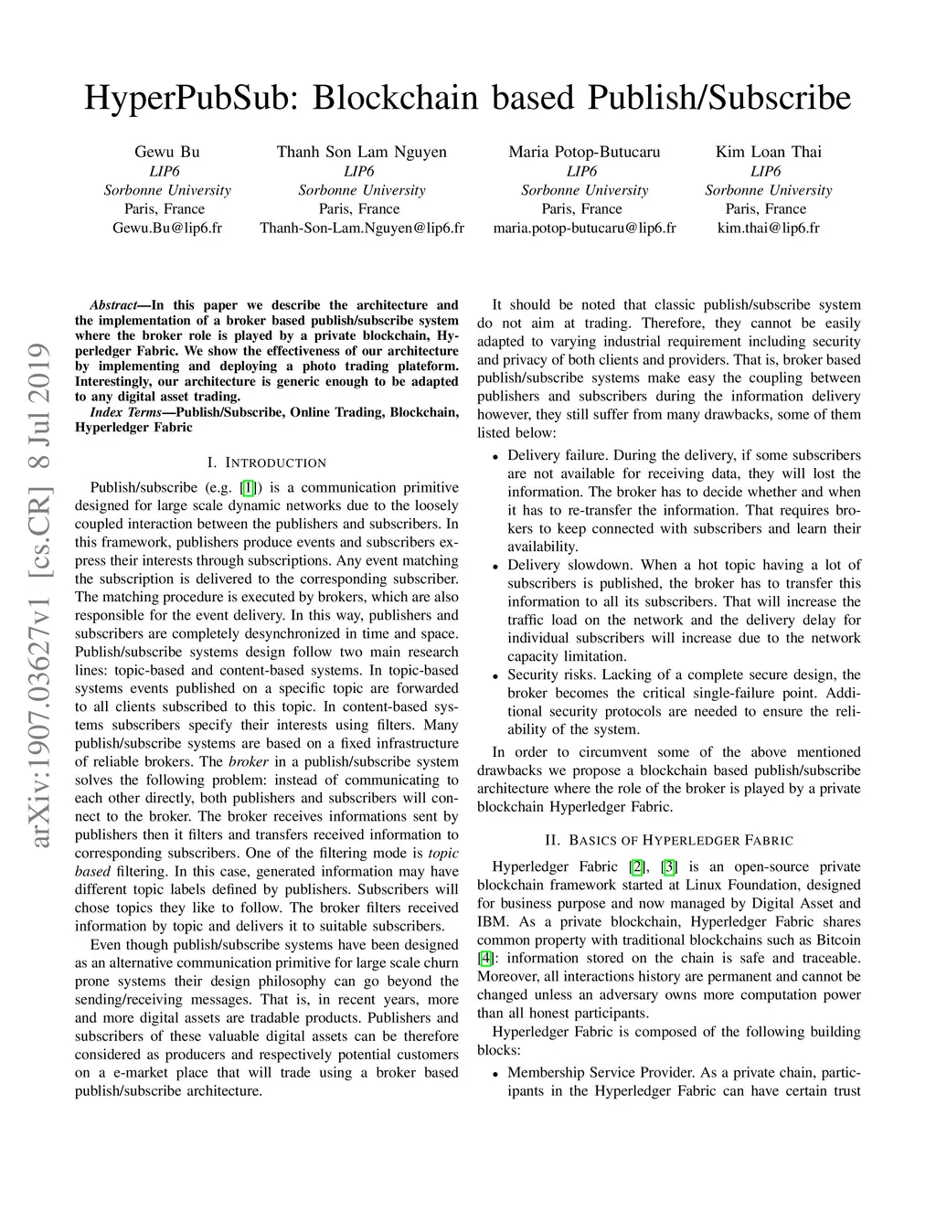 In this paper we describe the architecture and the implementation of a broker based publish/subscribe system where the broker role is played by a private blockchain, Hy-perledger Fabric. We show the effectiveness of our architecture by implementing and deploying a photo trading plateform. Interestingly, our architecture is generic enough to be adapted to any digital asset trading.