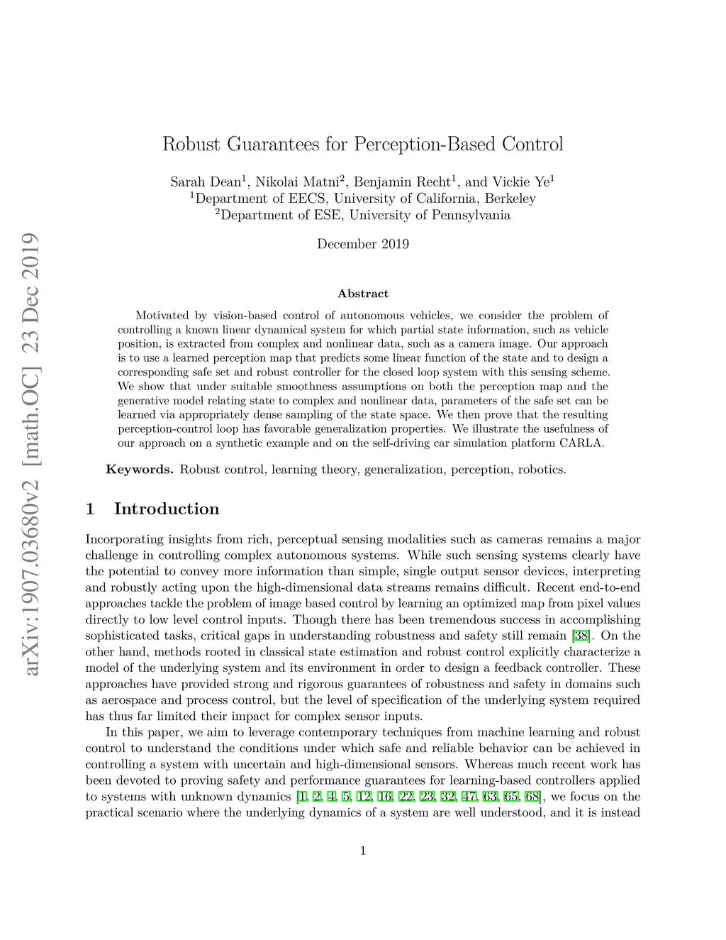 Motivated by vision-based control of autonomous vehicles, we consider the problem of controlling a known linear dynamical system for which partial state information, such as vehicle position, is extracted from complex and nonlinear data, such as a camera image. Our approach is to use a learned perception map that predicts some linear function of the state and to design a corresponding safe set and robust controller for the closed loop system with this sensing scheme. We show that under suitable smoothness assumptions on both the perception map and the generative model relating state to complex and nonlinear data, parameters of the safe set can be learned via appropriately dense sampling of the state space. We then prove that the resulting perception-control loop has favorable generalization properties. We illustrate the usefulness of our approach on a synthetic example and on the self-driving car simulation platform CARLA.