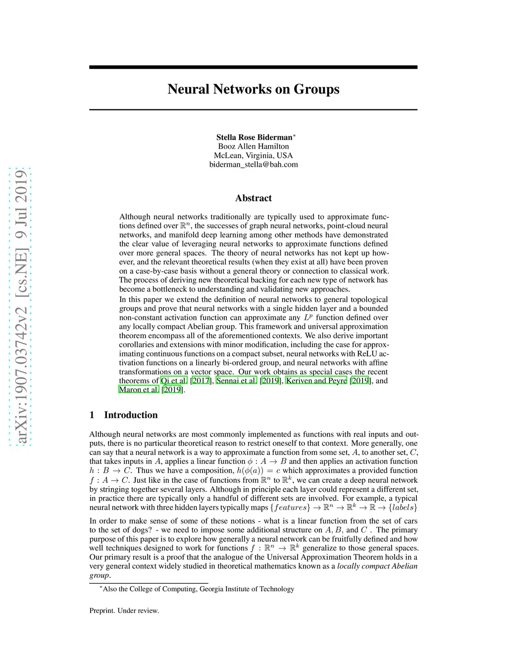 Although neural networks traditionally are typically used to approximate functions defined over , the successes of graph neural networks, point-cloud neural networks, and manifold deep learning among other methods have demonstrated the clear value of leveraging neural networks to approximate functions defined over more general spaces. The theory of neural networks has not kept up however,and the relevant theoretical results (when they exist at all) have been proven on a case-by-case basis without a general theory or connection to classical work. The process of deriving new theoretical backing for each new type of network has become a bottleneck to understanding and validating new approaches. In this paper we extend the definition of neural networks to general topological groups and prove that neural networks with a single hidden layer and a bounded non-constant activation function can approximate any function defined over any locally compact Abelian group. This framework and universal approximation theorem encompass all of the aforementioned contexts. We also derive important corollaries and extensions with minor modification, including the case for approximating continuous functions on a compact subset, neural networks with ReLU activation functions on a linearly bi-ordered group, and neural networks with affine transformations on a vector space. Our work obtains as special cases the recent theorems of Qi et al. [2017], Sennai et al. [2019], Keriven and Peyre [2019], and Maron et al. [2019]