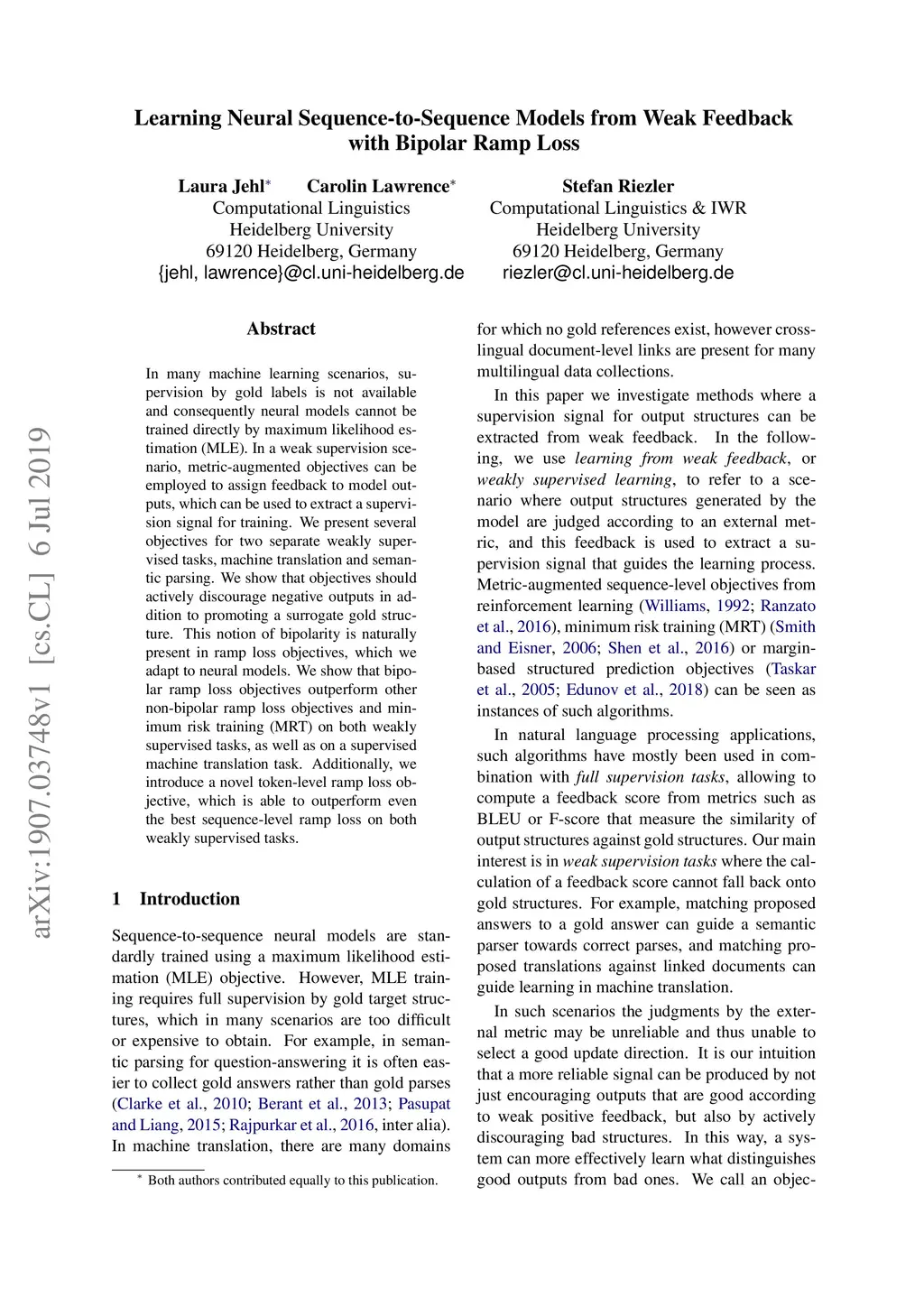 Learning Neural Sequence-to-Sequence Models from Weak Feedback with