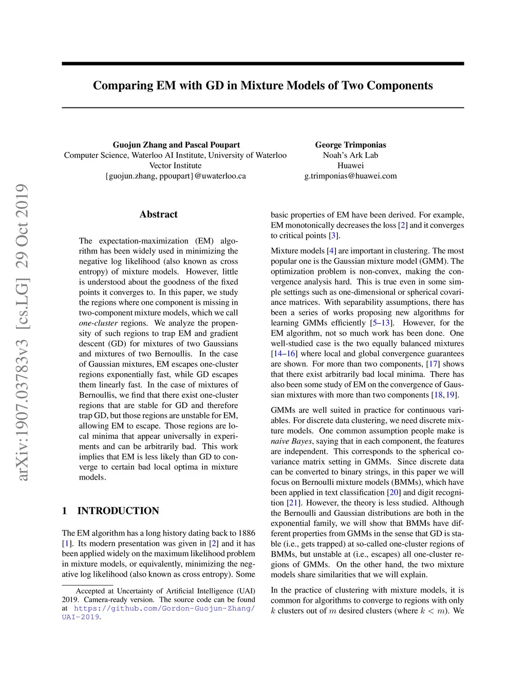 The expectation-maximization (EM) algorithm has been widely used in minimizing the negative log likelihood (also known as cross entropy) of mixture models. However, little is understood about the goodness of the fixed points it converges to. In this paper, we study the regions where one component is missing in two-component mixture models, which we call one-cluster regions. We analyze the propensity of such regions to trap EM and gradient descent (GD) for mixtures of two Gaussians and mixtures of two Bernoullis. In the case of Gaussian mixtures, EM escapes one-cluster regions exponentially fast, while GD escapes them linearly fast. In the case of mixtures of Bernoullis, we find that there exist one-cluster regions that are stable for GD and therefore trap GD, but those regions are unstable for EM, allowing EM to escape. Those regions are local minima that appear universally in experiments and can be arbitrarily bad. This work implies that EM is less likely than GD to converge to certain bad local optima in mixture models.