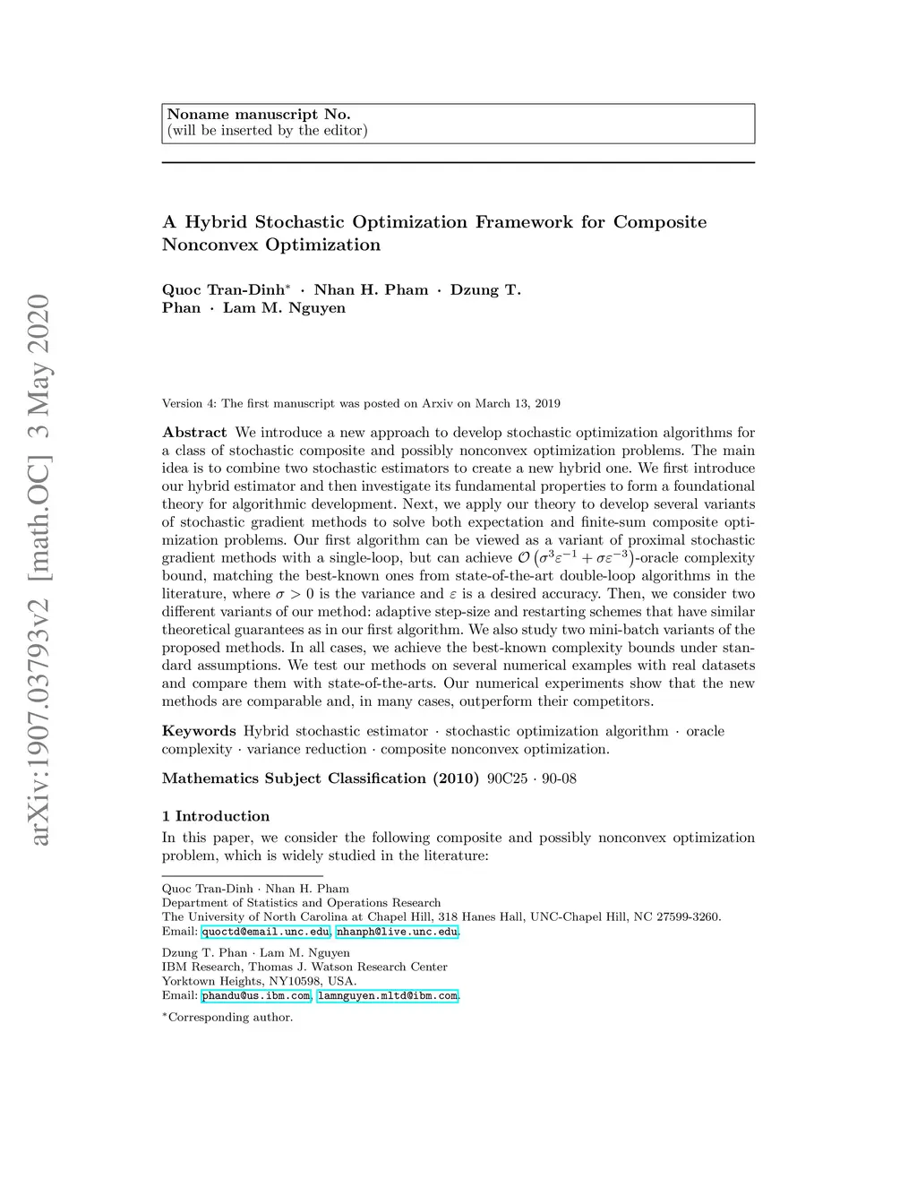 We introduce a new approach to develop stochastic optimization algorithms for a class of stochastic composite and possibly nonconvex optimization problems. The main idea is to combine two stochastic estimators to create a new hybrid one. We first introduce our hybrid estimator and then investigate its fundamental properties to form a foundational theory for algorithmic development. Next, we apply our theory to develop several variants of stochastic gradient methods to solve both expectation and finite-sum composite optimization problems. Our first algorithm can be viewed as a variant of proximal stochastic gradient methods with a single-loop, but can achieve -oracle complexity bound, matching the best-known ones from state-of-the-art double-loop algorithms in the literature, where is the variance and is a desired accuracy. Then, we consider two different variants of our method: adaptive step-size and restarting schemes that have similar theoretical guarantees as in our first algorithm. We also study two mini-batch variants of the proposed methods. In all cases, we achieve the best-known complexity bounds under standard assumptions. We test our methods on several numerical examples with real datasets and compare them with state-of-the-arts. Our numerical experiments show that the new methods are comparable and, in many cases, outperform their competitors.