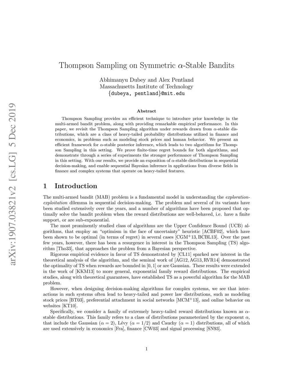 Thompson Sampling provides an efficient technique to introduce prior knowledge in the multi-armed bandit problem, along with providing remarkable empirical performance. In this paper, we revisit the Thompson Sampling algorithm under rewards drawn from symmetric -stable distributions, which are a class of heavy-tailed probability distributions utilized in finance and economics, in problems such as modeling stock prices and human behavior. We present an efficient framework for posterior inference, which leads to two algorithms for Thompson Sampling in this setting. We prove finite-time regret bounds for both algorithms, and demonstrate through a series of experiments the stronger performance of Thompson Sampling in this setting. With our results, we provide an exposition of symmetric -stable distributions in sequential decision-making, and enable sequential Bayesian inference in applications from diverse fields in finance and complex systems that operate on heavy-tailed features.