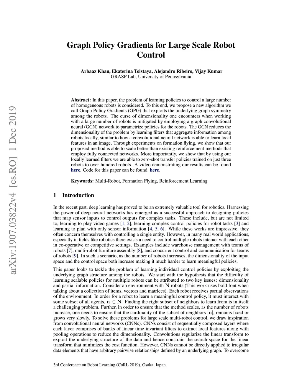 In this paper, we consider the problem of learning policies to control a large number of homogeneous robots. To this end, we propose a new algorithm we call Graph Policy Gradients (GPG) that exploits the underlying graph symmetry among the robots. The curse of dimensionality one encounters when working with a large number of robots is mitigated by employing a graph convolutional neural (GCN) network to parametrize policies for the robots. The GCN reduces the dimensionality of the problem by learning filters that aggregate information among robots locally, similar to how a convolutional neural network is able to learn local features in an image. Through experiments on formation flying, we show that our proposed method is able to scale better than existing reinforcement methods that employ fully connected networks. More importantly, we show that by using our locally learned filters we are able to zero-shot transfer policies trained on just three robots to over hundred robots.