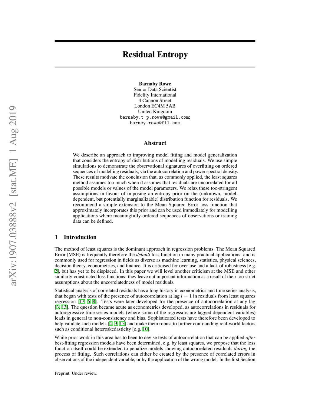 We describe an approach to improving model fitting and model generalization that considers the entropy of distributions of modelling residuals. We use simple simulations to demonstrate the observational signatures of overfitting on ordered sequences of modelling residuals, via the autocorrelation and power spectral density. These results motivate the conclusion that, as commonly applied, the least squares method assumes too much when it assumes that residuals are uncorrelated for all possible models or values of the model parameters. We relax these too-stringent assumptions in favour of imposing an entropy prior on the (unknown, model-dependent, but potentially marginalizable) distribution function for residuals. We recommend a simple extension to the Mean Squared Error loss function that approximately incorporates this prior and can be used immediately for modelling applications where meaningfully-ordered sequences of observations or training data can be defined.