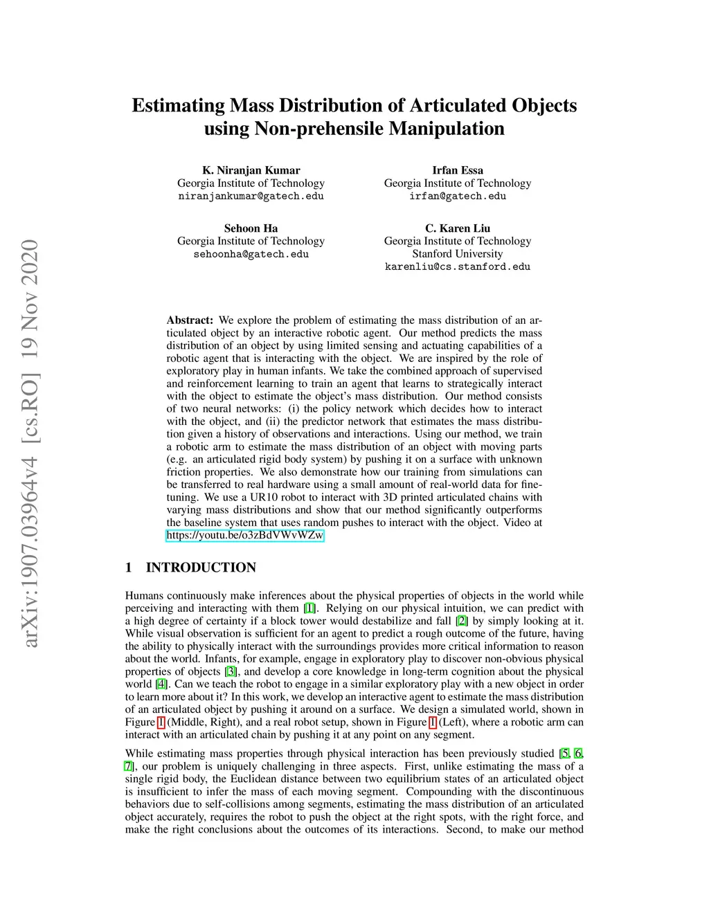 Estimating Mass Distribution of Articulated Objects using Non-prehensile
