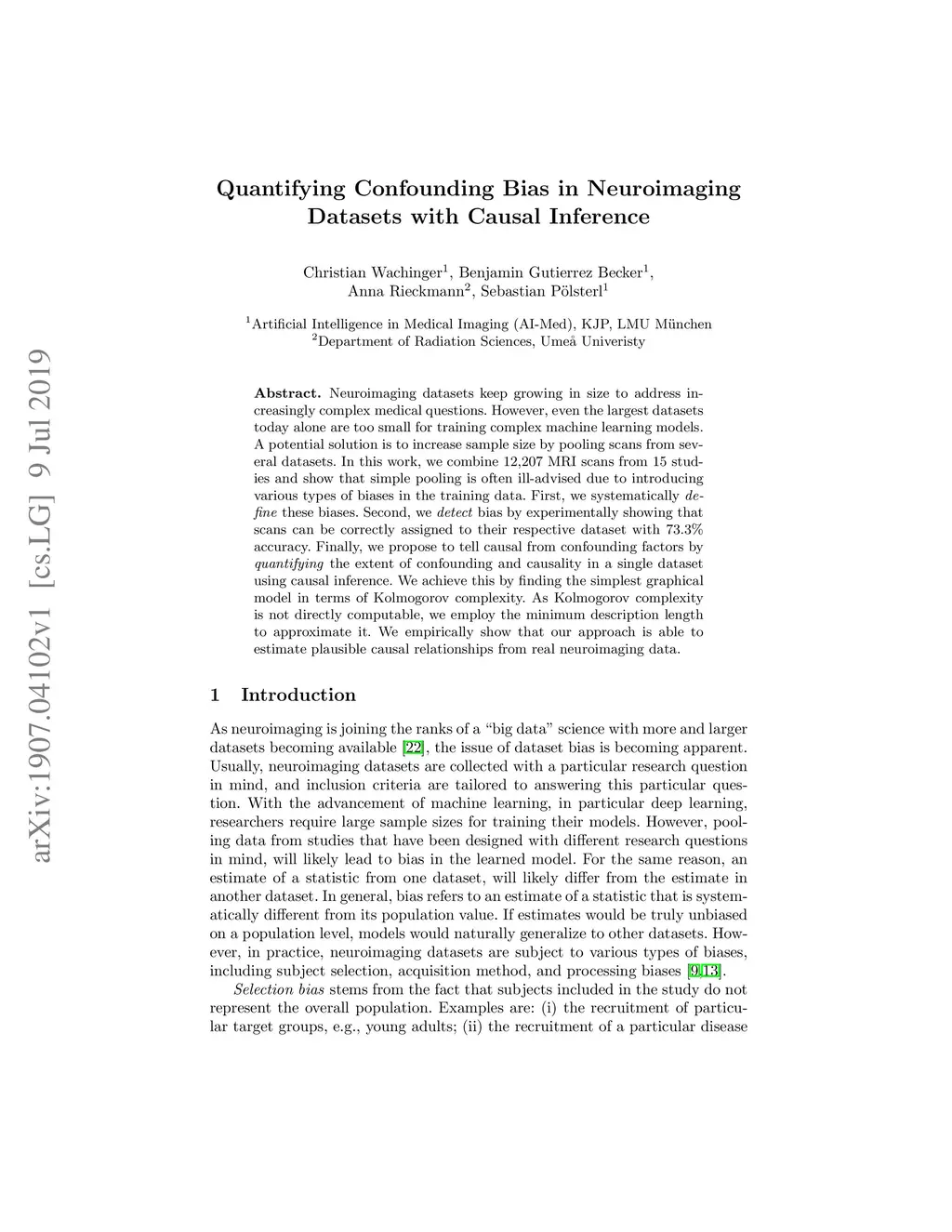 Neuroimaging datasets keep growing in size to address increasingly complex medical questions. However, even the largest datasets today alone are too small for training complex machine learning models. A potential solution is to increase sample size by pooling scans from several datasets. In this work, we combine 12,207 MRI scans from 15 studies and show that simple pooling is often ill-advised due to introducing various types of biases in the training data. First, we systematically define these biases. Second, we detect bias by experimentally showing that scans can be correctly assigned to their respective dataset with 73.3% accuracy. Finally, we propose to tell causal from confounding factors by quantifying the extent of confounding and causality in a single dataset using causal inference. We achieve this by finding the simplest graphical model in terms of Kolmogorov complexity. As Kolmogorov complexity is not directly computable, we employ the minimum description length to approximate it. We empirically show that our approach is able to estimate plausible causal relationships from real neuroimaging data.
