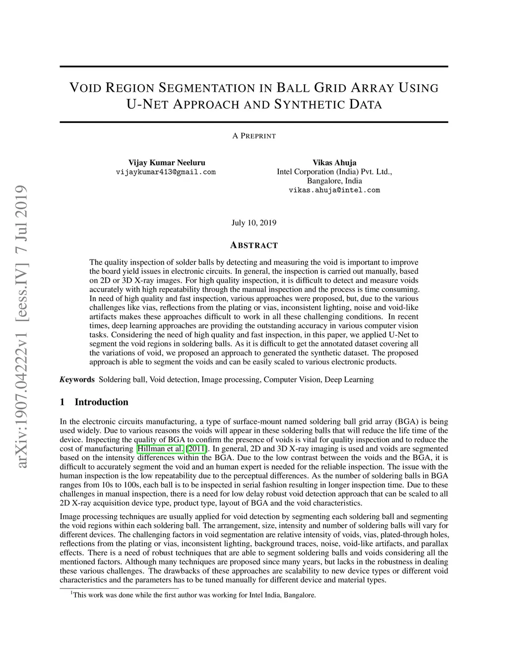 The quality inspection of solder balls by detecting and measuring the void is important to improve the board yield issues in electronic circuits. In general, the inspection is carried out manually, based on 2D or 3D X-ray images. For high quality inspection, it is difficult to detect and measure voids accurately with high repeatability through the manual inspection and the process is time consuming. In need of high quality and fast inspection, various approaches were proposed, but, due to the various challenges like vias, reflections from the plating or vias, inconsistent lighting, noise and void-like artifacts makes these approaches difficult to work in all these challenging conditions. In recent times, deep learning approaches are providing the outstanding accuracy in various computer vision tasks. Considering the need of high quality and fast inspection, in this paper, we applied U-Net to segment the void regions in soldering balls. As it is difficult to get the annotated dataset covering all the variations of void, we proposed an approach to generated the synthetic dataset. The proposed approach is able to segment the voids and can be easily scaled to various electronic products.