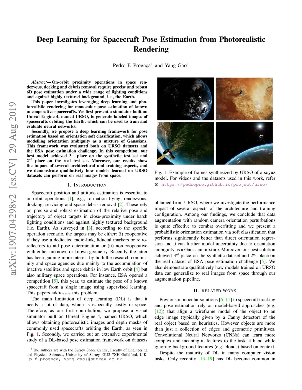 On-orbit proximity operations in space rendezvous, docking and debris removal require precise and robust 6D pose estimation under a wide range of lighting conditions and against highly textured background, i.e., the Earth. This paper investigates leveraging deep learning and photorealistic rendering for monocular pose estimation of known uncooperative spacecrafts. We first present a simulator built on Unreal Engine 4, named URSO, to generate labeled images of spacecrafts orbiting the Earth, which can be used to train and evaluate neural networks. Secondly, we propose a deep learning framework for pose estimation based on orientation soft classification, which allows modelling orientation ambiguity as a mixture of Gaussians. This framework was evaluated both on URSO datasets and the ESA pose estimation challenge. In this competition, our best model achieved 3rd place on the synthetic test set and 2nd place on the real test set. Moreover, our results show the impact of several architectural and training aspects, and we demonstrate qualitatively how models learned on URSO datasets can perform on real images from space.