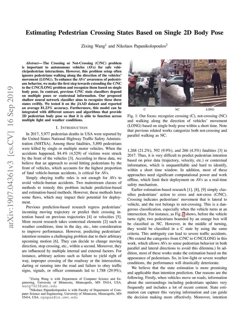 Crossing or Not-Crossing (C/NC) problem is important to autonomous vehicles (AVs) to safely interact with pedestrians. However, this problem setup ignores pedestrians walking along the direction of vehicles' movement (LONG). To enhance AVs' awareness of pedestrians behavior, we make the first step towards extending C/NC to C/NC/LONG problem and recognize them based on single body pose. In contrast, previous C/NC state classification work depend on multiple poses or contextual information. Our proposed shallow neural network classifier is able to recognize these three states within a very short time. We test our it on JAAD dataset and report average 81.23% accuracy. In order to further improve the classifier's performance, we introduce a computational-efficient method, action momentum optimizer (AMO), which correct prediction based on crossing behavior pattern. And our experiment shows that classifier perform at most 11.39% better on continuous pose test with the help of it. Furthermore, this model can cooperate with different sensors and algorithms that provide 2D pedestrian body pose so that it is able to work across multiple light and weather conditions. In addition, we have created extended annotations of pose for JAAD dataset, which will be publicly released soon