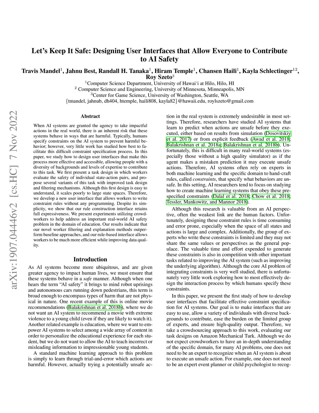 When AI systems are granted the agency to take impactful actions in the real world, there is an inherent risk that these systems behave in ways that are harmful. Typically, humans specify constraints on the AI system to prevent harmful behavior; however, very little work has studied how best to facilitate this difficult constraint specification process. In this paper, we study how to design user interfaces that make this process more effective and accessible, allowing people with a diversity of backgrounds and levels of expertise to contribute to this task. We first present a task design in which workers evaluate the safety of individual state-action pairs, and propose several variants of this task with improved task design and filtering mechanisms. Although this first design is easy to understand, it scales poorly to large state spaces. Therefore, we develop a new user interface that allows workers to write constraint rules without any programming. Despite its simplicity, we show that our rule construction interface retains full expressiveness. We present experiments utilizing crowdworkers to help address an important real-world AI safety problem in the domain of education. Our results indicate that our novel worker filtering and explanation methods outperform baseline approaches, and our rule-based interface allows workers to be much more efficient while improving data quality.