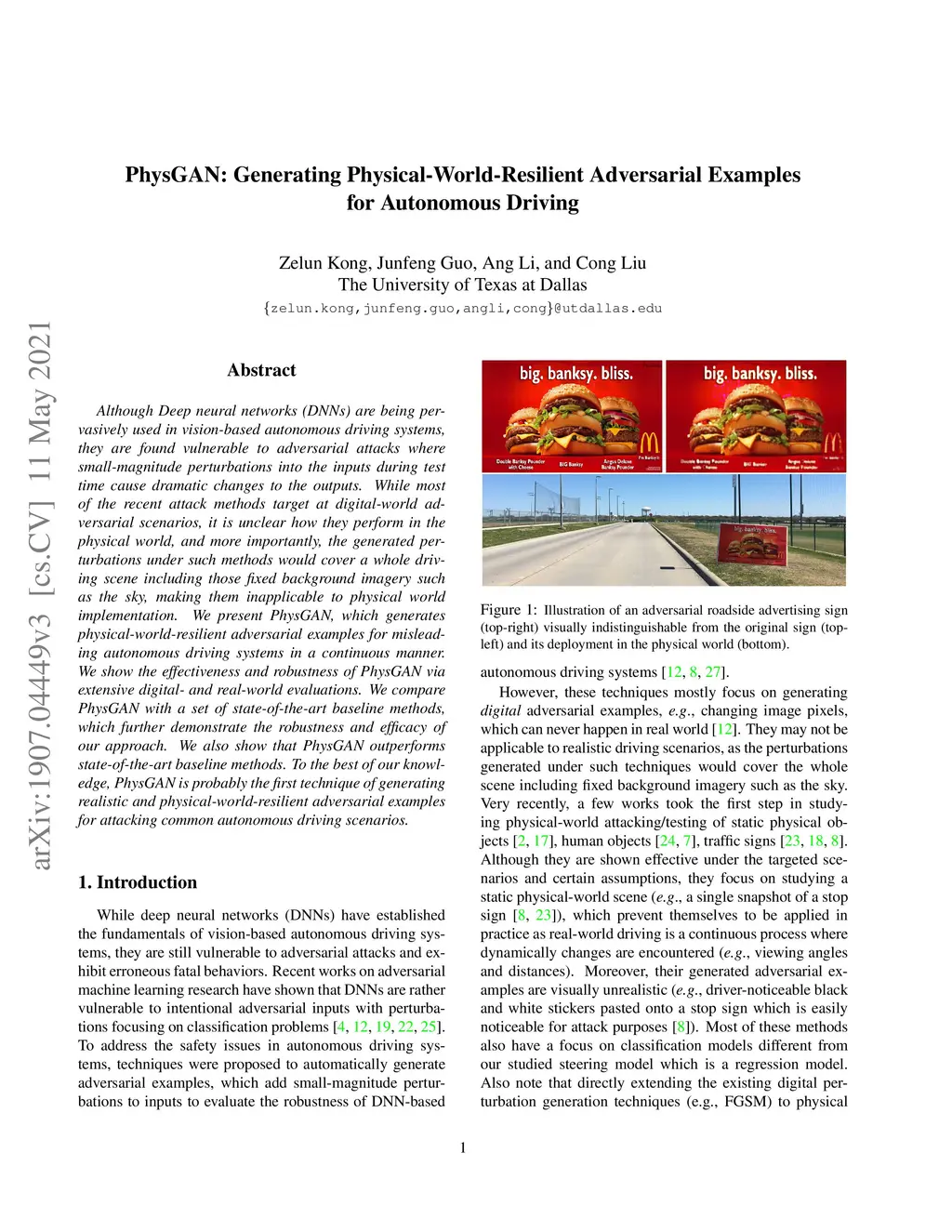 Although Deep neural networks (DNNs) are being pervasively used in vision-based autonomous driving systems, they are found vulnerable to adversarial attacks where small-magnitude perturbations into the inputs during test time cause dramatic changes to the outputs. While most of the recent attack methods target at digital-world adversarial scenarios, it is unclear how they perform in the physical world, and more importantly, the generated perturbations under such methods would cover a whole driving scene including those fixed background imagery such as the sky, making them inapplicable to physical world implementation. We present PhysGAN, which generates physical-world-resilient adversarial examples for mislead-ing autonomous driving systems in a continuous manner. We show the effectiveness and robustness of PhysGAN via extensive digital and real-world evaluations. Digital experiments show that PhysGAN is effective for various steer-ing models and scenes, which misleads the average steer-ing angle by up to 23.06 degrees under various scenarios. The real-world studies further demonstrate that PhysGAN is sufficiently resilient in practice, which misleads the average steering angle by up to 19.17 degrees. We compare PhysGAN with a set of state-of-the-art baseline methods including several of our self-designed ones, which further demonstrate the robustness and efficacy of our approach. We also show that PhysGAN outperforms state-of-the-art baseline methods To the best of our knowledge, PhysGANis probably the first technique of generating realistic and physical-world-resilient adversarial examples for attacking common autonomous driving scenarios.