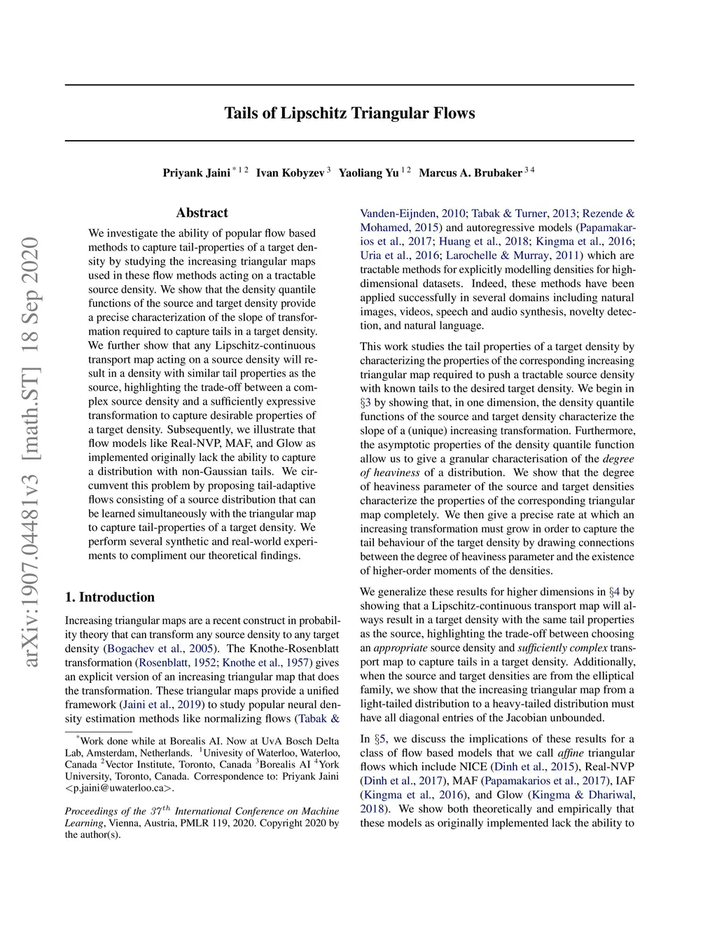 We investigate the ability of popular flow based methods to capture tail-properties of a target density by studying the increasing triangular maps used in these flow methods acting on a tractable source density. We show that the density quantile functions of the source and target density provide a precise characterization of the slope of transformation required to capture tails in a target density. We further show that any Lipschitz-continuous transport map acting on a source density will result in a density with similar tail properties as the source, highlighting the trade-off between a complex source density and a sufficiently expressive transformation to capture desirable properties of a target density. Subsequently, we illustrate that flow models like Real-NVP, MAF, and Glow as implemented originally lack the ability to capture a distribution with non-Gaussian tails. We circumvent this problem by proposing tail-adaptive flows consisting of a source distribution that can be learned simultaneously with the triangular map to capture tail-properties of a target density. We perform several synthetic and real-world experiments to compliment our theoretical findings.