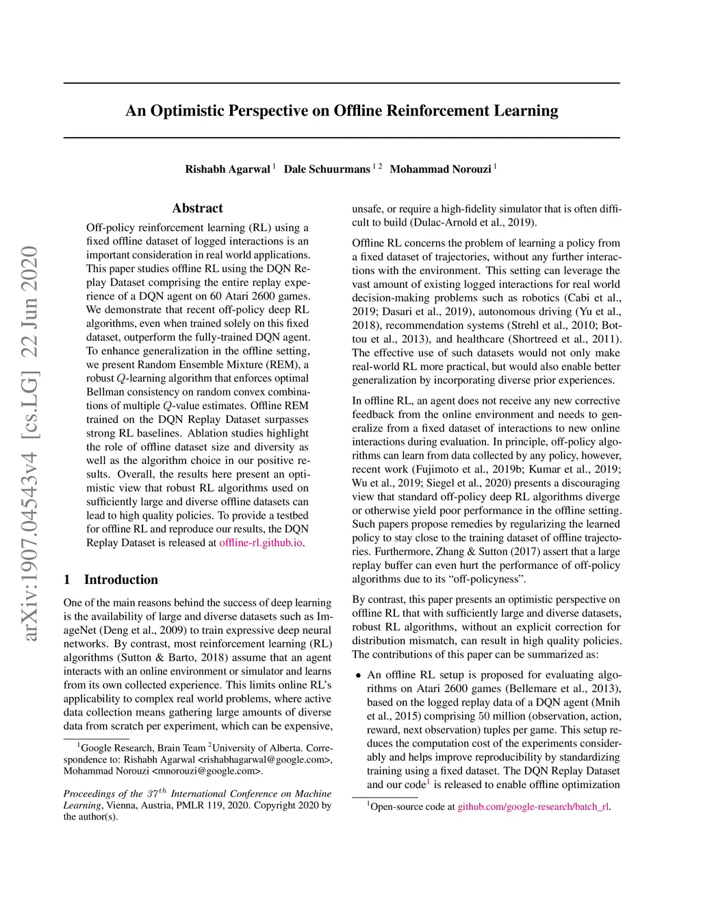 Off-policy reinforcement learning (RL) using a fixed offline dataset of logged interactions is an important consideration in real world applications. This paper studies offline RL using the DQN replay dataset comprising the entire replay experience of a DQN agent on 60 Atari 2600 games. We demonstrate that recent off-policy deep RL algorithms, even when trained solely on this fixed dataset, outperform the fully trained DQN agent. To enhance generalization in the offline setting, we present Random Ensemble Mixture (REM), a robust Q-learning algorithm that enforces optimal Bellman consistency on random convex combinations of multiple Q-value estimates. Offline REM trained on the DQN replay dataset surpasses strong RL baselines. Ablation studies highlight the role of offline dataset size and diversity as well as the algorithm choice in our positive results. Overall, the results here present an optimistic view that robust RL algorithms trained on sufficiently large and diverse offline datasets can lead to high quality policies. The DQN replay dataset can serve as an offline RL benchmark and is open-sourced.