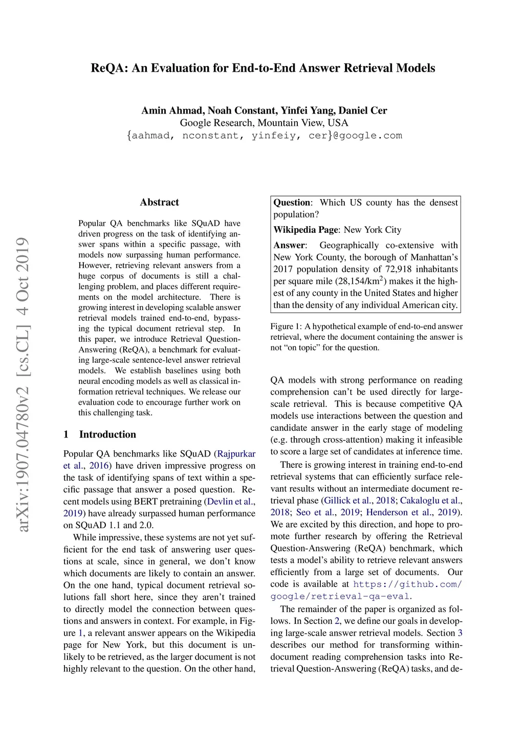 ReQA: An Evaluation for End-to-End Answer Retrieval Models