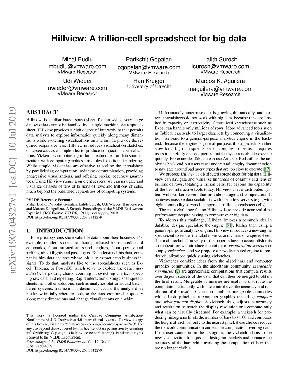 Hillview is a distributed spreadsheet for browsing very large datasets that cannot be handled by a single machine. As a spreadsheet, Hillview provides a high degree of interactivity that permits data analysts to explore information quickly along many dimensions while switching visualizations on a whim. To provide the required responsiveness, Hillview introduces visualization sketches, or vizketches, as a simple idea to produce compact data visualizations. Vizketches combine algorithmic techniques for data summarization with computer graphics principles for efficient rendering. While simple, vizketches are effective at scaling the spreadsheet by parallelizing computation, reducing communication, providing progressive visualizations, and offering precise accuracy guarantees. Using Hillview running on eight servers, we can navigate and visualize datasets of tens of billions of rows and trillions of cells, much beyond the published capabilities of competing systems.