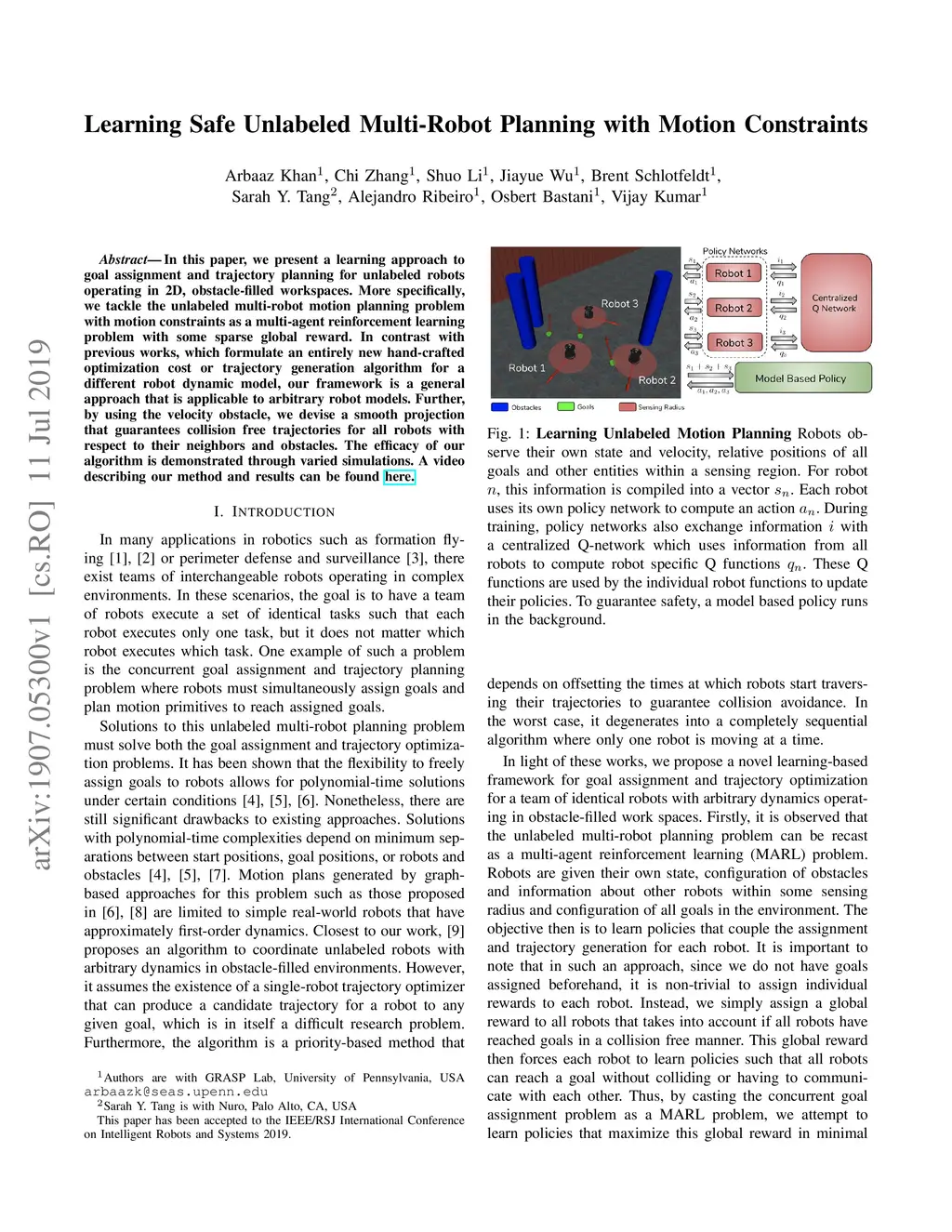 In this paper, we present a learning approach to goal assignment and trajectory planning for unlabeled robots operating in 2D, obstacle-filled workspaces. More specifically, we tackle the unlabeled multi-robot motion planning problem with motion constraints as a multi-agent reinforcement learning problem with some sparse global reward. In contrast with previous works, which formulate an entirely new hand-crafted optimization cost or trajectory generation algorithm for a different robot dynamic model, our framework is a general approach that is applicable to arbitrary robot models. Further, by using the velocity obstacle, we devise a smooth projection that guarantees collision free trajectories for all robots with respect to their neighbors and obstacles. The efficacy of our algorithm is demonstrated through varied simulations.