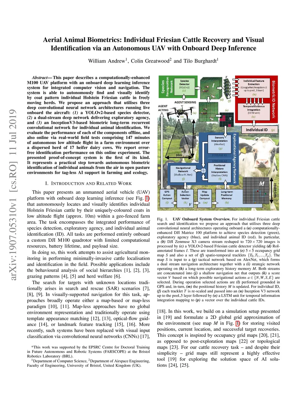 This paper describes a computationally-enhanced M100 UAV platform with an onboard deep learning inference system for integrated computer vision and navigation able to autonomously find and visually identify by coat pattern individual Holstein Friesian cattle in freely moving herds. We propose an approach that utilises three deep convolutional neural network architectures running live onboard the aircraft; that is, a YoloV2-based species detector, a dual-stream CNN delivering exploratory agency and an InceptionV3-based biometric LRCN for individual animal identification. We evaluate the performance of each of the components offline, and also online via real-world field tests comprising 146.7 minutes of autonomous low altitude flight in a farm environment over a dispersed herd of 17 heifer dairy cows. We report error-free identification performance on this online experiment. The presented proof-of-concept system is the first of its kind and a successful step towards autonomous biometric identification of individual animals from the air in open pasture environments for tag-less AI support in farming and ecology.